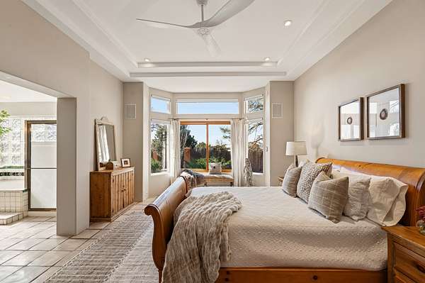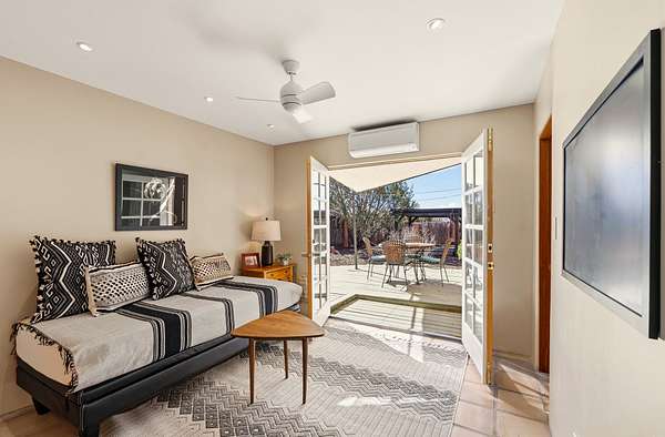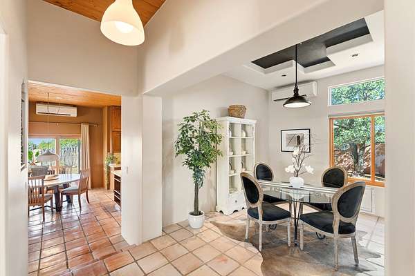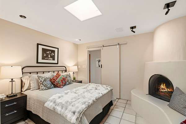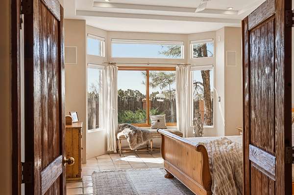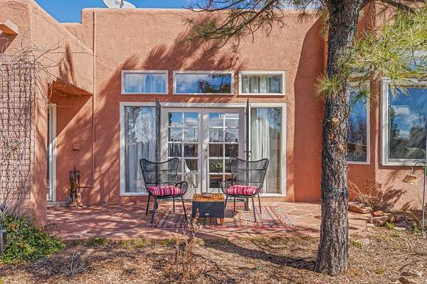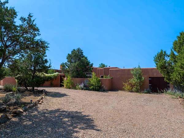 Sited on 5 acres in Dos Griegos and just 20 minutes from the Santa Fe Plaza, this inviting property offers a main house, an attached casita and a 250 sq. ft. attached storage room. A thoughtful nod to sustainable living is reflected in the two-year-old solar array with a rare Pearl Certification and a transferable warranty. Upon entering the home, the formal living room welcomes you with soaring ceilings, vigas, and abundant natural light. A double-sided wood-burning fireplace connects this elegant space to the kitchen's secondary living area, creating warmth and continuity between the rooms. French doors in the living room open to the landscaped backyard, inviting indoor-outdoor living. The kitchen, living, and dining areas form the heart of the home with direct access to a flowing koi pond, where the gentle sound of falling water creates a peaceful year-round setting. Tucked quietly off the kitchen through the laundry room, an additional suite offers a private retreat with its own living room, bedroom, and bath-ideal as an additional primary suite, guest quarters, or studio. In the main home's bedroom wing, the spacious primary suite enjoys abundant southern light and features a colorful bath with soaking tub and walk-in shower. A walk-in closet connects to a dedicated office, creating a flexible work or creative space. The guest bedroom includes a wood-burning kiva fireplace and ensuite bath. The backyard features an organic garden, tranquil koi pond, and southwest-facing patio ideal for outdoor dining. No HOA dues. Served by natural gas and Eldorado community water. A versatile property offering space for generational living or gathering with family and friends.