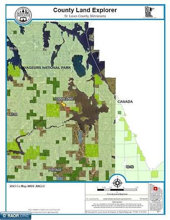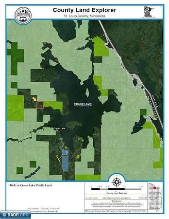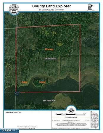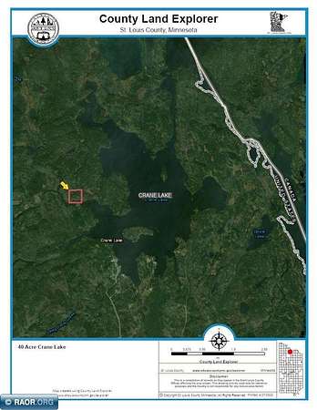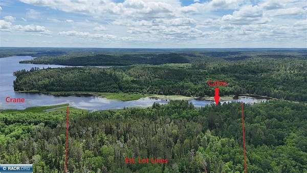 Est $2,071/moThis 40-acre boat access property with 1440 ft of gradual sloping shoreline is located on Crane Lake right before entering Rollick Creek (Snake Creek). Located off the main lake, it is protected from occasional high winds and rough waters. Property has higher elevation with mature timber near the rear of the 40 acres and adjoins 1000's of acres of federal & state land making for great hunting opportunities. This property comes with a small bunk cabin, electric, and storage shed. Structures have little to no value. Nice location for future cabin/home. Seller will be escrowing funds for a new septic through the Crane Lake Sewer District at closing. Crane Lake is the south entry point into Voyageurs National Park, the BWCA and Canada.