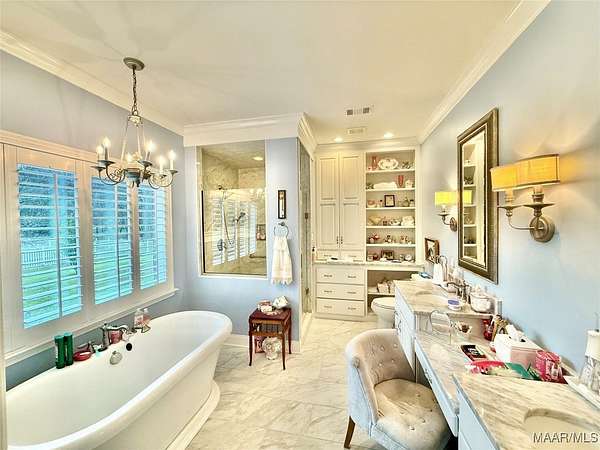 - Attic, Breakfast Bar, Double Vanity, Garden Tub Roman Tub, High Ceilings, Kitchen Island, Linen Closet, Programmable Thermostat, Pull Down Attic Stairs, Separate Shower, Walk In Closets, Window Treatments