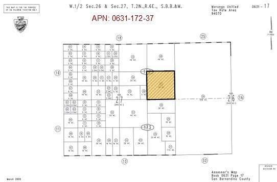 40 Acres (APN: 0631-172-37) GPS: 34.233140, -116.338395 This 40 acre property is located in Joshua Tree, CA. San Bernardino County has zoned this property Homestead Valley/Rural Living 5 Ac Minimum (HV/RL-5). The primary use is residential homes, some of the other permitted uses within this zoning are: accessory crop production, agricultural accessory structure, small family daycare facility or licensed residential care facility. Commercial renewable energy facilities are permitted in RL zoning according to the San Bernardino Development Code. Overhead electricity is available approx 1960 ft northwest of the property near Winters Rd and Lambert Ln. Joshua Basin Water District services the area. Residents have septic tanks for their sewer needs and propane tanks for their gas needs. Floodway maps show the property is NOT in any flood zones and there are no blue lines within the property. Living in Joshua Tree, CA, offers a unique blend of natural beauty and laid-back desert living. Imagine building your desert getaway and waking up to bright desert sunrises, panoramic views of rugged mountains, or dark starry nights. Endless opportunities for outdoor adventures are a short drive away in Joshua Tree National Park. There's always something exciting to explore. Plus, the tight-knit community fosters a sense of belonging, with local shops, art galleries, and events showcasing the area's vibrant culture. Whether you're seeking tranquility or adventure, Joshua Tree welcomes you with open arms. This property does not yet have an address. While the boundary lines on the map offer a glimpse, they are only approximate. A Buyer should verify boundaries, zoning and utilities, ensuring every aspect aligns with their vision for the property. Nearby properties also for sale.