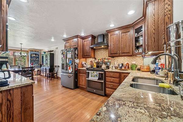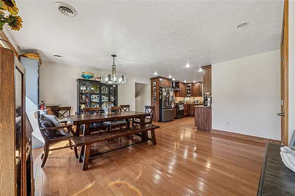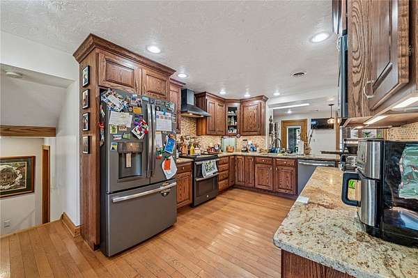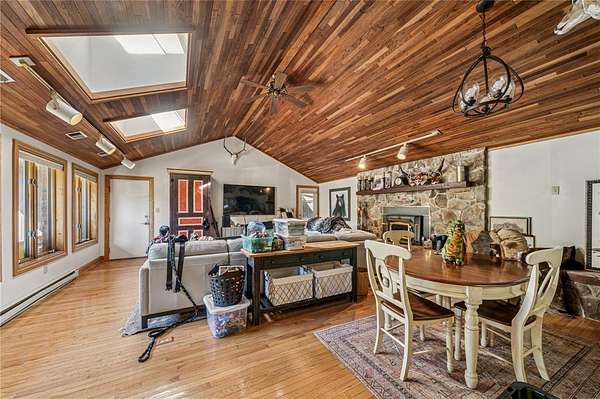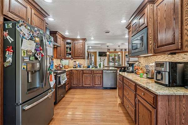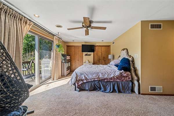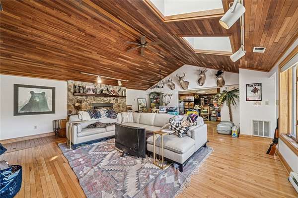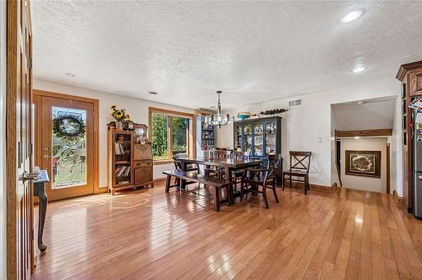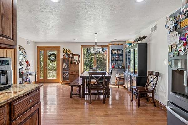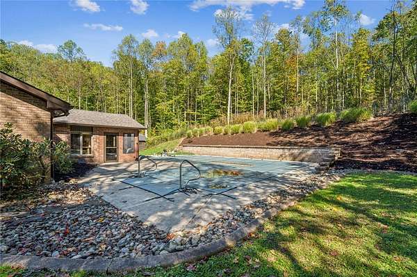 Sprawling Multi Level Home in Country Setting. Richly appointed home enjoys 2+ Acres including creek frontage. 3 bay garage for vehicles w/over head attic storage. Lower level boasts family room w/lg game area & wood burning fireplace; Living rm w/fireplace currently used as office; separate entry makes it easy to greet guests; powder rm completes this level. Main level is home to kitchen with rich solid wood cabinetry; gorgeous granite counter tops & breakfast bar; stainless appliances. Open dining rm easily accomodates a large gathering & celebrations. 3 good sized bedrooms are on this level in close proximity to a large bathroom. Closets with organizer features. The 3 season room enjoys views of the fenced in, heated L Shaped inground pool. Upstairs you will discover the owner's private suite; bedroom with balcony & views of the private grounds. Huge walk in closet; laundry & lg bath w separate shower; tub; seated vanity, commode. Rich hardwoods thru out. Shed for pool gear.
