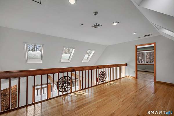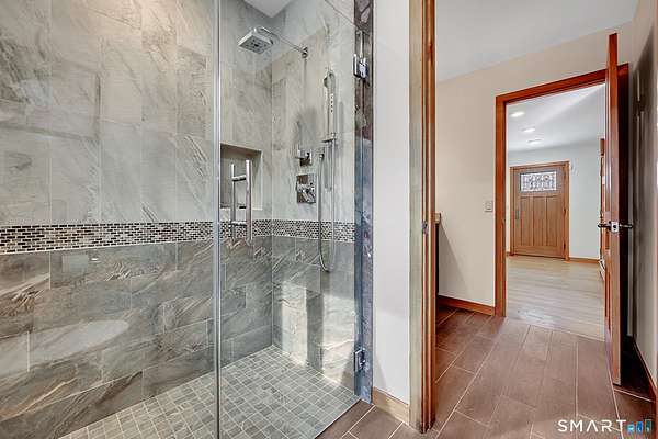 Tucked along a private drive and framed by professionally designed landscaping, this light-filled Cape offers generous space and carefully curated updates throughout. A welcoming foyer leads to a well-appointed kitchen with quality cabinetry, quartz countertops, tile backsplash, and a breakfast nook. The living room showcases vaulted ceilings, skylights, a fireplace, and sliders opening to a deck overlooking the level backyard. Two bedrooms and a beautifully finished full bath complete the main level; the rear bedroom includes its own slider to a private deck. The bath is appointed with natural stone tile, a custom quartz-topped vanity, and a frameless glass shower. A spacious dining room and dedicated laundry room add convenience. Upstairs, the primary suite offers a serene retreat with a spa-like bath featuring a custom double vanity, quartz countertop, mosaic inlay shower detail, natural stone flooring, and an oversized frameless glass enclosure. A generous walk-in closet with custom built-ins completes the suite. A sunlit loft overlooks the living space below and leads to a comfortable home office. The finished lower level provides flexible living space, a full bath, closet, utility room, and sliders that bring in an abundance of natural light. Solar panels enhance energy efficiency. Additional features include a whole-house generator, water softener, pH neutralizing system, and alarm system. Lovingly maintained. Set in a desirable location.