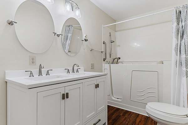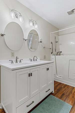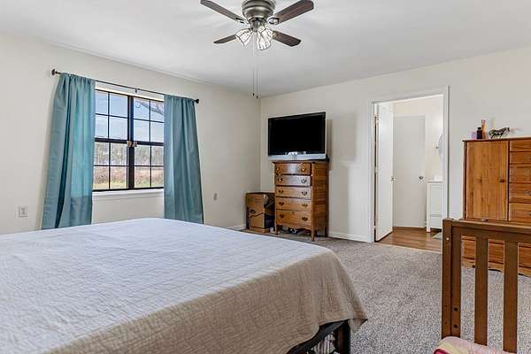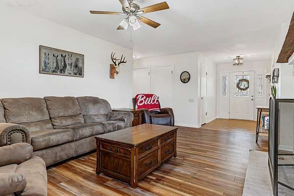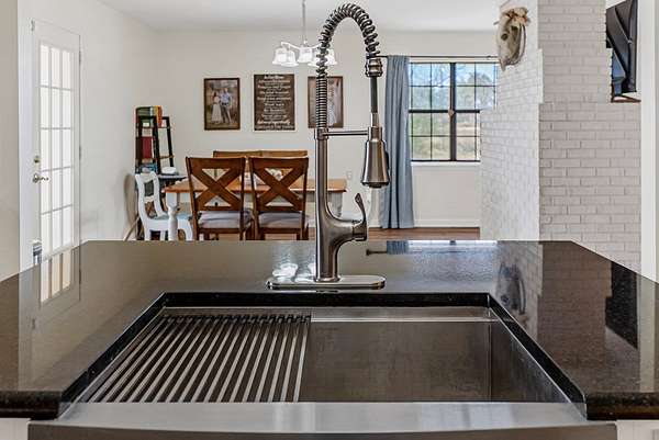 This well-appointed brick home offers comfort, functionality, and accessibility, all set on nearly 2 acres. Featuring 3 bedrooms and 3 full bathrooms, the home boasts an open-concept layout ideal for everyday living and entertaining. The updated kitchen showcases a new island with prep sink, granite countertops, tile backsplash, and all new stainless steel appliances, including a gas range. A separate walk-in pantry provides excellent storage. The dining and living areas are divided by a charming brick fireplace, creating warmth and character. Just off the living area, French doors lead to a bright sunroom, perfect for relaxing or enjoying views of the property. The spacious laundry room includes a convenient full bathroom. The primary suite features a walk-in closet and an en-suite bath with a new double vanity and a walk-in handicap-accessible tub/shower. Two additional guest bedrooms are located nearby and share a bathroom with a walk-in tiled shower. Designed with accessibility in