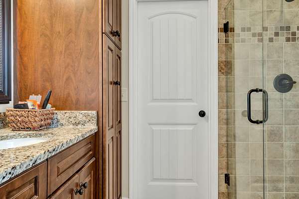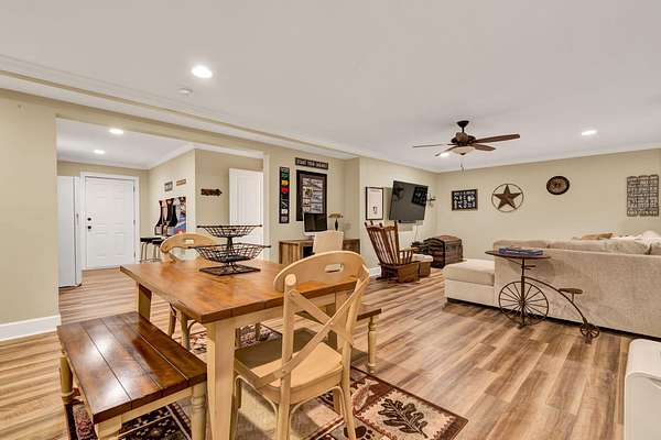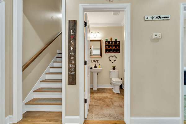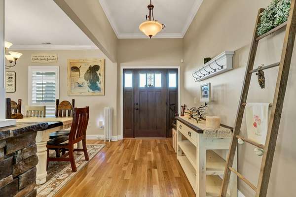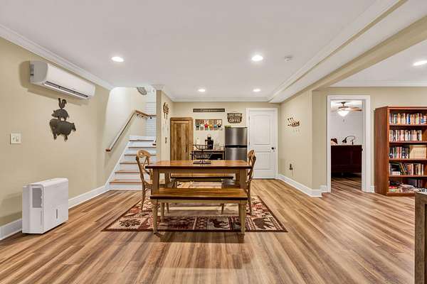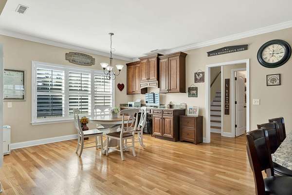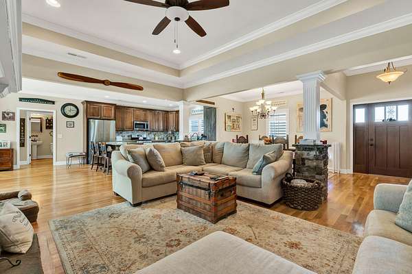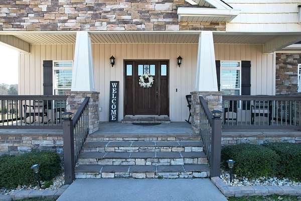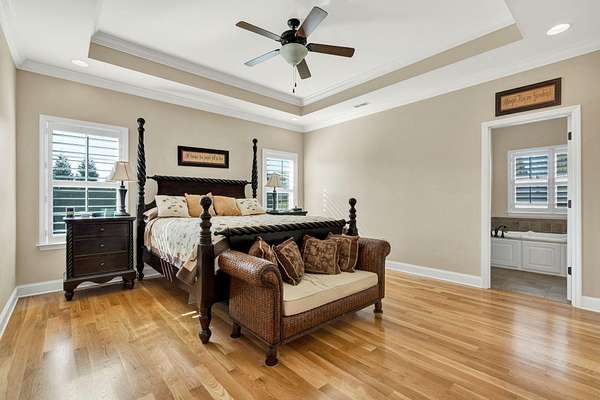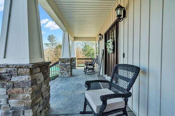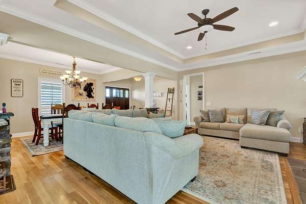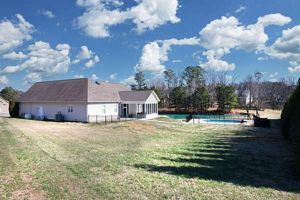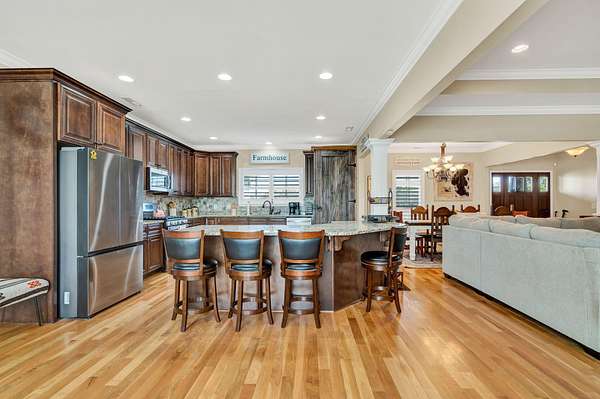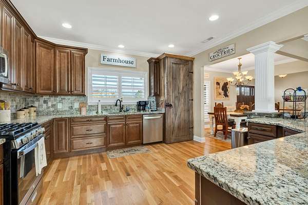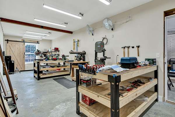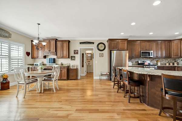 This exceptional custom residence offers approximately 4,200 square feet of thoughtfully designed living space, situated on 1.84 private acres and showcasing an impressive combination of refined interior craftsmanship, functional design, and outstanding outdoor amenities. With four bedrooms and three and a half bathrooms, this home provides both space and versatility while delivering a private retreat in a highly desirable setting. The main level features an open floor plan designed for comfortable everyday living and seamless entertaining. Crown molding throughout and tray ceilings in select spaces add architectural depth and elegance. Custom plantation shutters accent every window, allowing natural light while maintaining privacy and timeless style. The kitchen is a standout with all new appliances, including a GE microwave, Samsung refrigerator, Whirlpool dishwasher, GE gas cooktop with electric oven, and a new garbage disposal. A custom built barn door adds character and functionality to the pantry, while generous cabinetry and counter space make this kitchen ideal for both daily use and hosting guests. The primary suite is conveniently located on the main level and serves as a true retreat. It features a large walk-in closet and a spa inspired en suite bathroom with dual vanities, a soaking tub, and a separate tiled walk-in shower. Additional bedrooms are well sized and thoughtfully positioned to accommodate family members or guests. The finished lower level greatly expands the living space and offers exceptional flexibility. This level includes a spacious entertainment area, office, craft room, heated and cooled workshop, and a third garage. Video games mounted in the basement entertainment area convey with the home, along with a desk located in the lower level office. In the second basement bedroom, the dresser and nightstand convey. The grey cabinetry in the basement coffee area also remains with the property, adding convenience and charm.