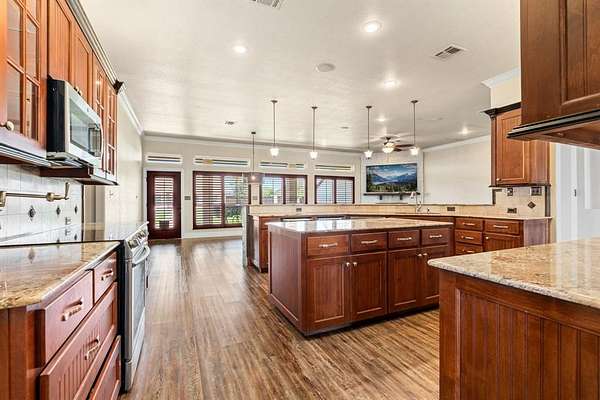 - Built-In Features, Built-In Wine Cooler, Cable TV Available, Decorative Lighting, Double Vanity, Dry Bar, Flat Screen Wiring, Granite Counters, High Speed Internet Available, In-Law Suite Floorplan, Kitchen Island, Natural Woodwork, Open Floorplan, Pantry, Second Primary Bedroom, Sound System Wiring, Walk-In Closet(s), Wet Bar