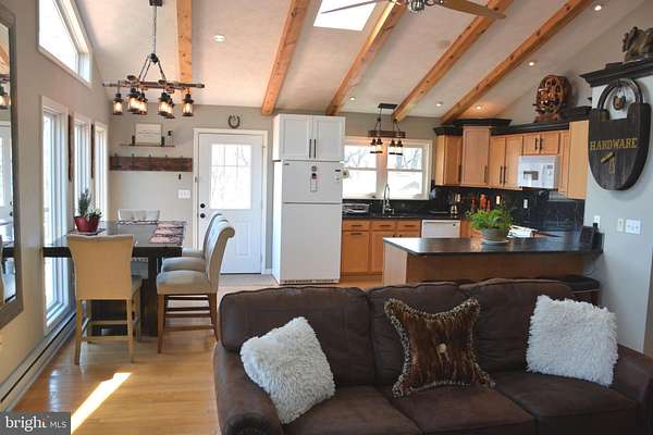 - Ceiling Fan(s), Combination Kitchen/Dining, Entry Level Bedroom, Exposed Beams, Island Kitchen, Open Floor Plan, Skylight(s), Upgraded Countertops, Water Treat System, Wet/Dry Bar, Window Treatments, Wood Floors