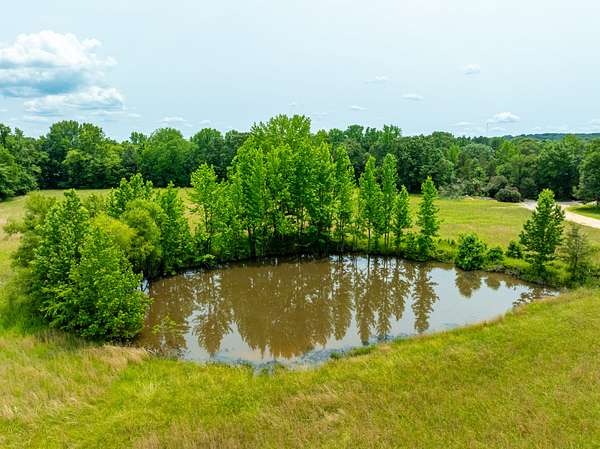 Land features include gentle rolling hills, open fields, and a large pond