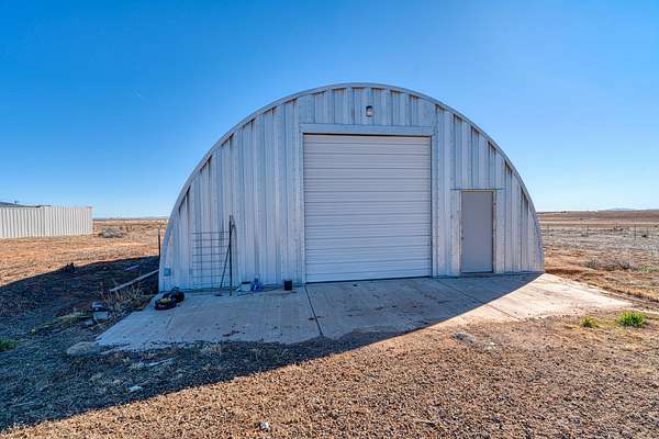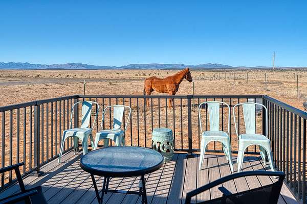 The primary residence is a double wide manufactured home featuring three bedrooms and two bathrooms arranged in an open floor plan. This home is fully handicap accessible and includes a large deck positioned to capture unobstructed views of the Manzano Mountains. From this vantage point, owners can enjoy sunsets, expansive skies, and the occasional sight of large antelope herds moving across the land.