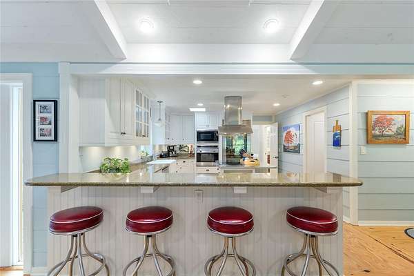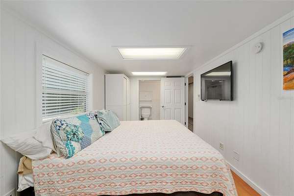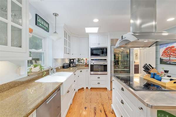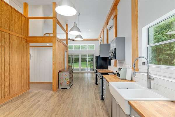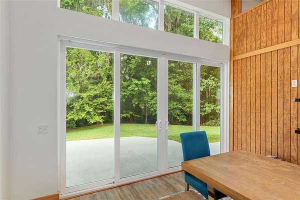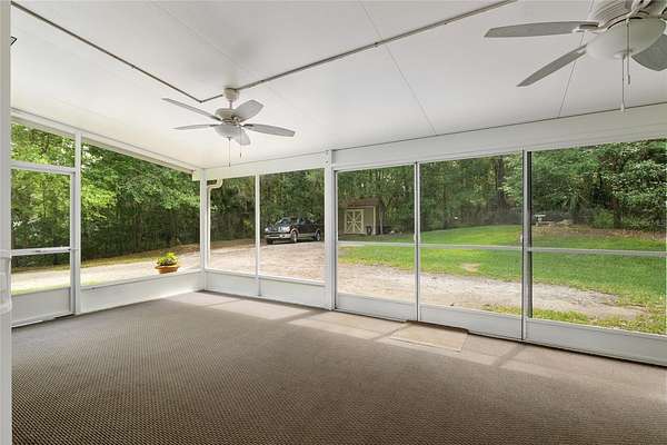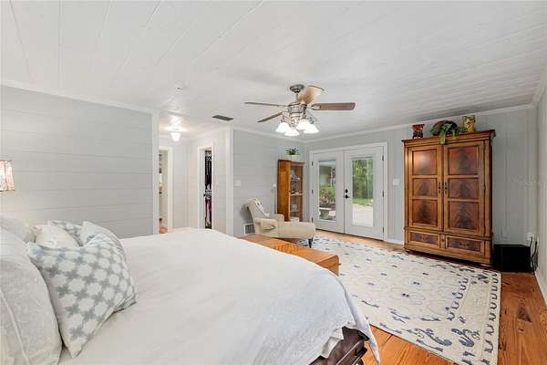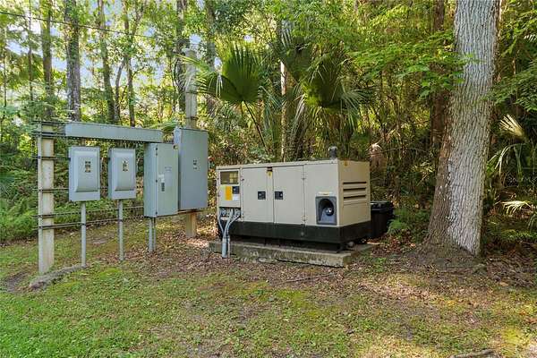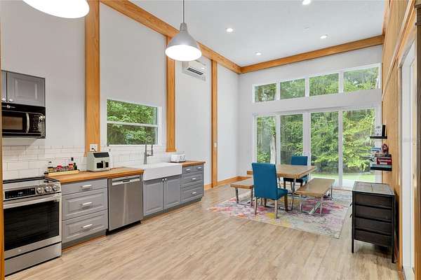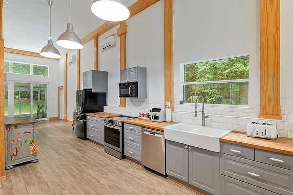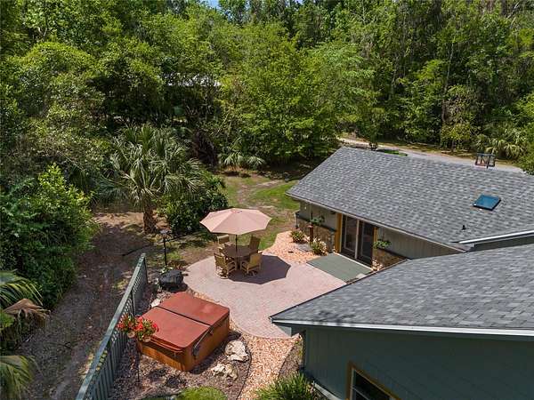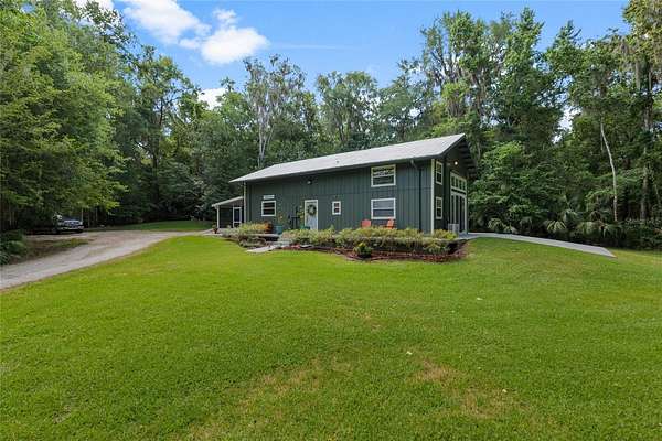 Two Beautiful Homes on 5 Acres with the Main home being a 3/2.5/2 with 2,000 Living Square Feet and the 2nd home is a 2/2 with 1475 Living Square Feet. This property is secluded & fenced in the heart of SE Ocala and the highly desirable 475 corridor. The main home is a 3/2.5/2 car garage with 2,000 Living Square Feet with a New architectural roof & 3 skylights in 2024. All main areas including primary suite have real wood floors and custom wood ceilings and walls. The living room has a cathedral beam ceiling, stone front wood burning fireplace with an open plan to dining area and kitchen. The light & bright kitchen has a breakfast bar, farm style sink, cooking island with stainless hood, stainless steel appliances including a SUB-ZERO glass view refrigerator, Wolf wall oven & microwave, two drawer dishwasher, granite counters, walk in pantry and wood ship lap walls. The primary bedroom has a walk-in closet, En-Suite bathroom with a walk-in shower and Granite top wood vanity with dual sinks. Second and third bedrooms also have custom wood walls and ceilings. Laundry has front load washer & dryer and a half bath. There is a lovely landscaped, paver patio oasis outside with a hot tub and outdoor shower in the secluded back yard. The front of the home has a tiered yard and landscaping with rock beds and an 8' x 16' screen room to enjoy the privacy of this entire property that no other homes can be seen from. Upgrades include a whole house water softener system with ultraviolet light purifying, reverse osmosis water at kitchen sink & ice maker, a 19 Seer AC system, new water heater, Anderson windows, newer drain fields (one for each home), utility shed for each home, irrigation system, a golf cart, cedar dry sauna and a 400 Amp electric service backed up by a commercial diesel generator that will run both homes with AC's in a power outage. The 2nd home is a 2-bedroom, 2-bath with 1475 Living Square Feet with high ceilings in an industrial design with a loft. The entire building is energy efficient with Icynene insulated steel walls and roof, insulated vinyl frame windows and high seer mini split AC system with multiple fan heads. This open plan, wood accented space has natural light from all the high windows and glass doors. There is a fully equipped kitchen with stainless steel & black appliances, gray cabinetry, butcher block counters, open to living room on one side and dining on the other. Downstairs bedroom has an En-Suite tiled bathroom with tub/shower and a marble top vanity. The 2nd bedroom is in a glass enclosed loft for privacy along with its own bathroom with a shower and custom wood vanity. Inside laundry room which also has sink hookups. The large 12' x 29' screened porch has privacy from the trees between both homes along with a patio across the whole front of the home. This great location along with its beautiful private setting is one you will not want to miss out on. See virtual tour link.