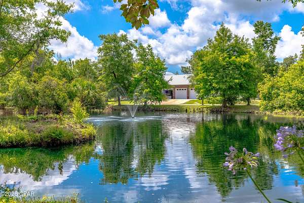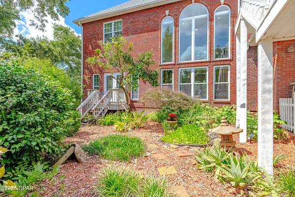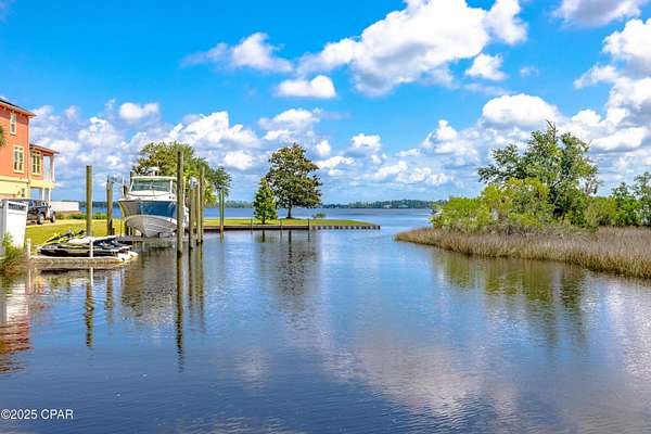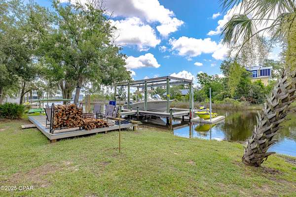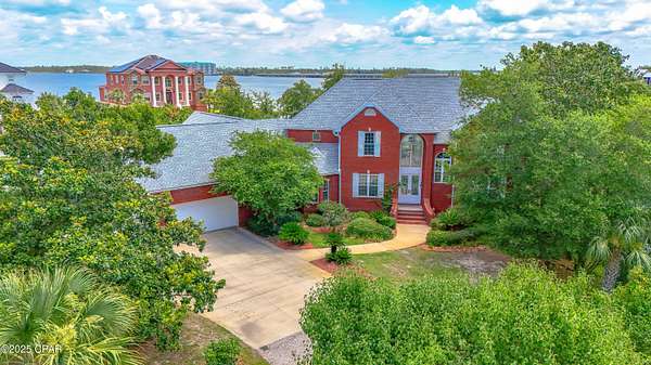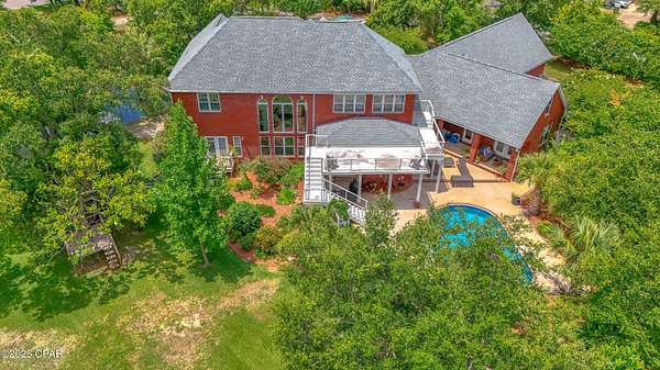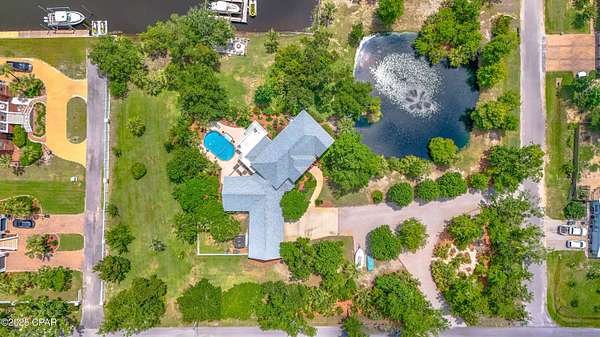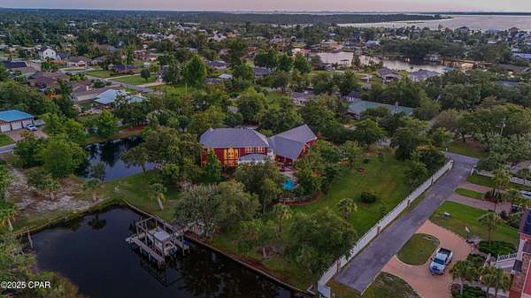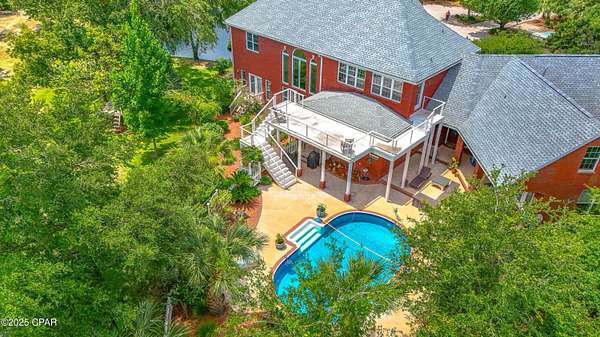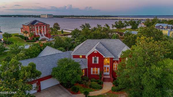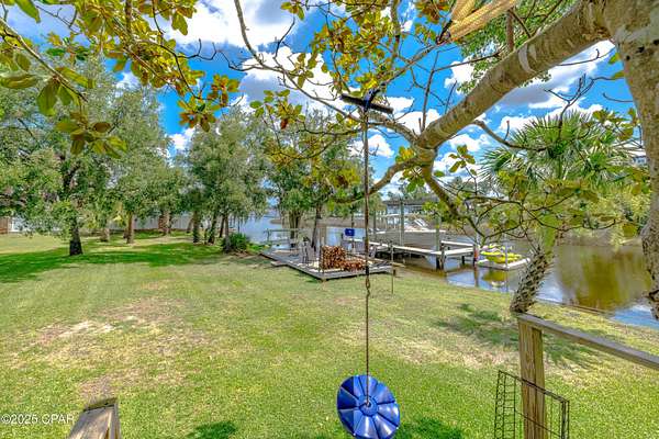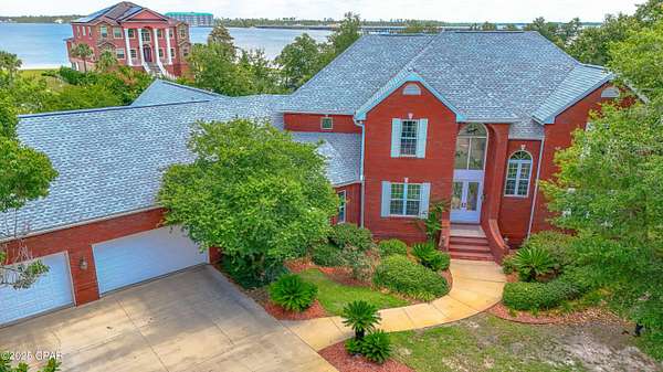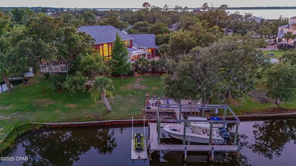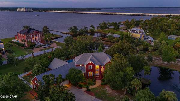 OWNER FINANCING AVAILABLE!! This beautiful 2 story WATERFRONT ESTATE has it all! Custom built in Lynn Haven, FL and tucked away on an oversized 2 acre corner lot in a very private setting and quiet neighborhood. Beautifully landscaped with a fish stocked pond, mature trees and an abundance of flowers with something blooming in all seasons. A boater's dream with deepwater access to North Bay and the Gulf from the newly replaced big dock with boat lift! 300 ft water front! Open floor plan on 5,500 sqft with 5 BR's and 5.5 baths. Downstairs you'll find the master bedroom and an additional bedroom with full bath and private entry to the pool area what is currently used as a media room and would make a perfect MIL suite or office. Upstairs are 3 more bedrooms, each with own bathroom. The house has beautiful views of the bay and yard from various rooms. The chef's kitchen with all new appliances including double ovens, Viking warming drawer and gas stove top overlooks the fenced in pool area. Vaulted ceilings, stained glass windows/doors, custom made gas fireplace! The large recreation room upstairs overlooking the bay has a wet bar and leads to the sun deck. Three more bonus rooms upstairs totaling over 800 sq ft - use as a craft room, play room, office or fitness area. Walk-in 110 sq ft attic with endless storage! The oversized 3 + car garage is every car collector's dream! The house has solid brick exterior with thick walls and 2 x 6 framing. The roof is NEWLY replaced in 2023. The house has 2 NEW HVAC units, 3 NEW hot water heaters including 1 tankless water heater and 2 electric water heaters and NEW central vacuum, an oversized laundry room with extra storage, his and hers walk-in closets in the master bedroom, and a long circular driveway with extra parking. The pool has a new liner plus filter system and takes minimal maintenance. The fenced-in garden area is perfect for a small vegetable garden with raised beds already in place and includes a garden shed. The huge boat dock is BRAND NEW 2024 replaced with high end composite decking and has an outdoor shower and a fish cleaning station. All windows, most doors and floors are new as well. Irrigation in the whole yard. There is a custom made treehouse with a zipline. Too many amenities to list. OWNER FINANCING AVAILABLE!!! Call for your showing today!