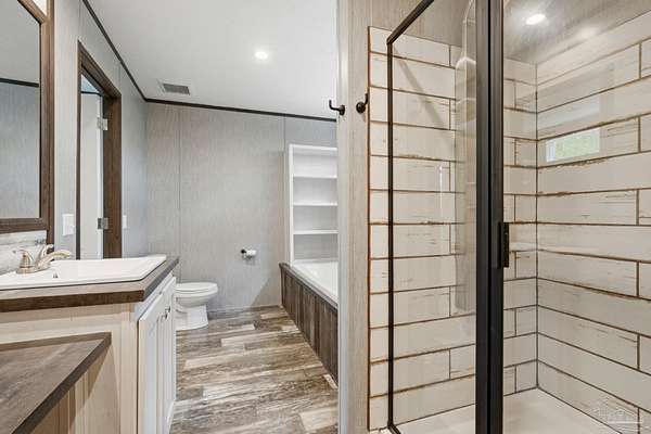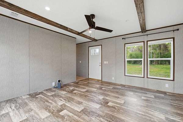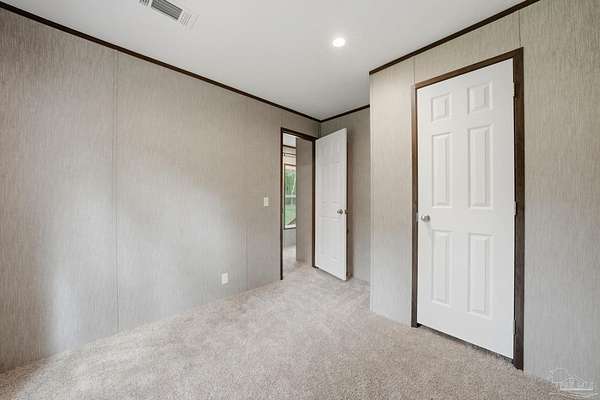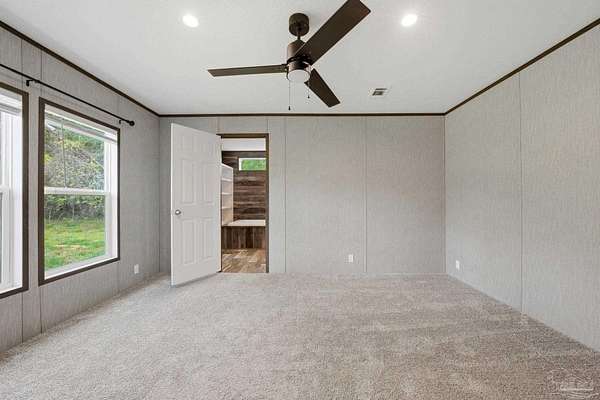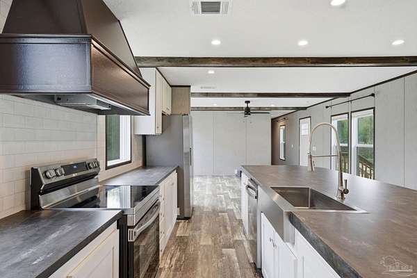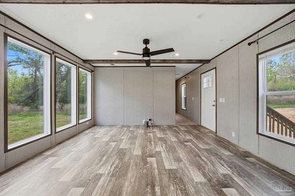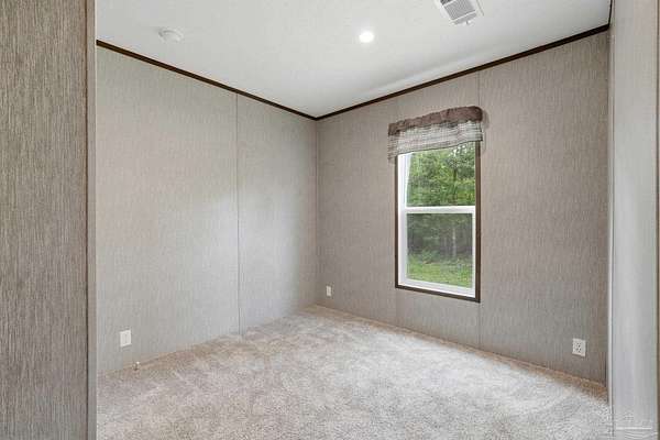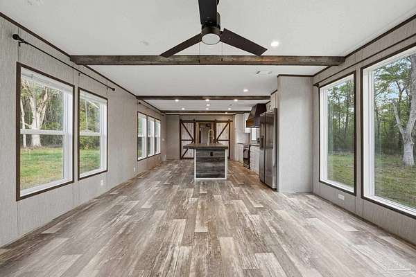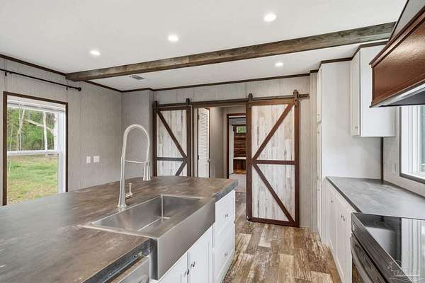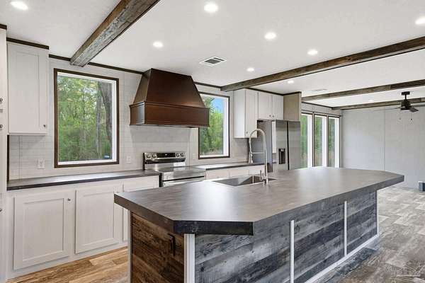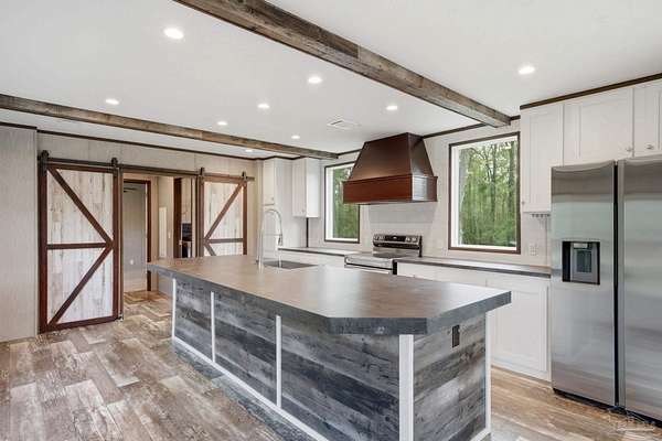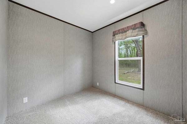 Private, secluded, and surrounded by nature-this 3-bedroom, 2-bath, split-plan, 2024-built home is tucked away on a beautifully wooded 4.5-ACRE parcel with no visible neighboring homes, offering a rare level of peace and privacy. Expansive picture windows in the living room frame stunning views of the surrounding woods, creating the perfect setting to watch deer and wildlife right from your home. A winding, wooded drive leads you into your own quiet retreat, where the home sits in a natural clearing while still being enveloped by mature trees. Inside, you'll find a bright, open-concept layout filled with natural light. The chef's dream kitchen features a HUGE island, stainless steel appliances, an apron-front (farm) sink, and a statement vent hood-perfect for both everyday living and entertaining. The split floor plan offers added privacy, with a generously sized primary suite separate from the additional bedrooms. The primary ensuite bath includes a double vanity, a glass walk-in shower, and a soaking tub with rustic wood accents. Secondary bedrooms are well-sized and share a full bath on the opposite side of the home. Step outside and enjoy expansive wooded acreage with endless potential-whether you're looking to add a workshop, create trails, or simply enjoy the quiet surroundings. Ideally located near Adventures Unlimited, Blackwater River State Forest, Bear Lake, and endless opportunities for hiking, swimming, canoeing, creekfront cabins, glamping/camping, zip lines, and outdoor exploration, this property delivers both seclusion and adventure. Washer and dryer included for added convenience.