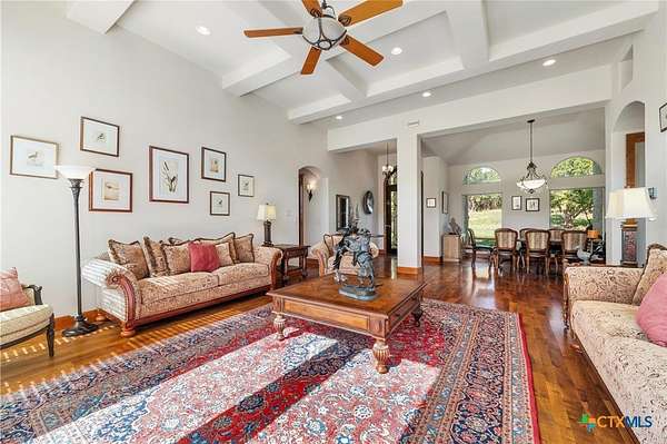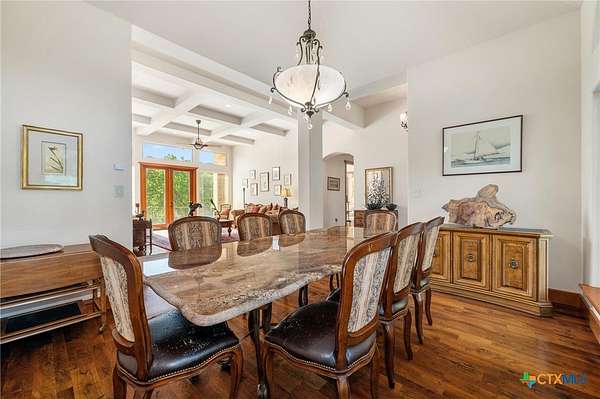 - Bookcases, Built In Features, Ceiling Fans, Chandelier, Coffered Ceilings, Dining Area, Double Vanity, Entrance Foyer, High Ceilings, Home Office, Jetted Tub, Kitchen Dining Combo, Living Dining Room, Main Level Primary, Open Floorplan, Primary Downstairs, Pull Down Attic Stairs, Separate Formal Dining Room, Split Bedrooms, Stone Counters, Wet Bar