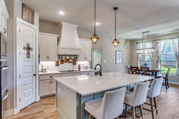 The gourmet kitchen is both stylish and functional, featuring a large center island with a farmhouse sink, double ovens, built-in microwave, and a walk-in pantry—perfect for cooking, hosting, and gathering with family and friends.