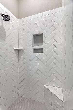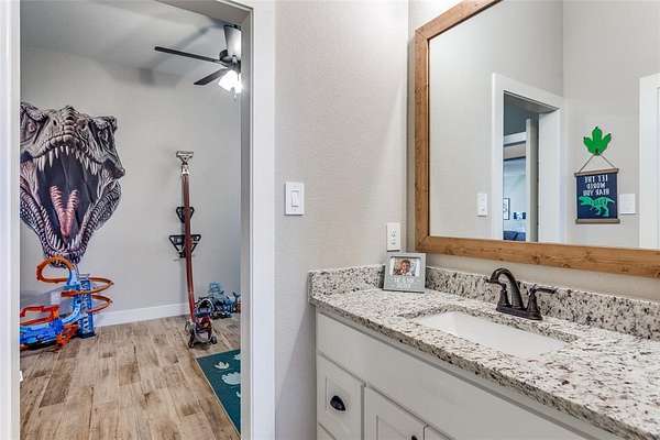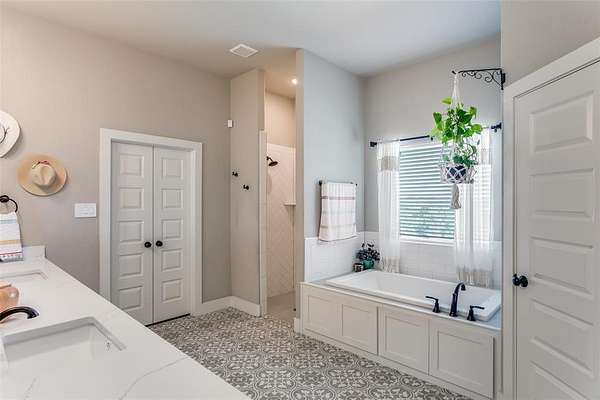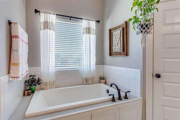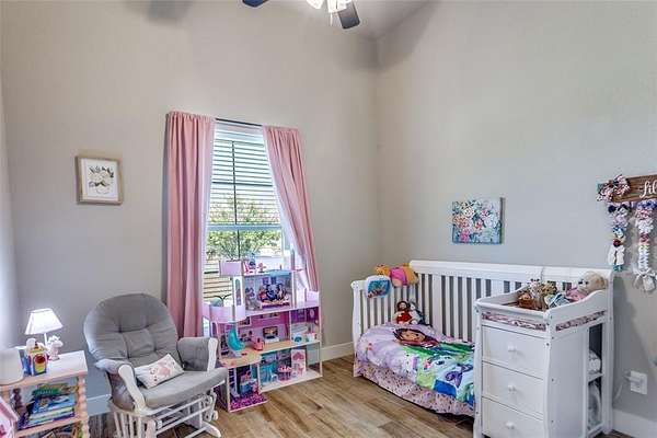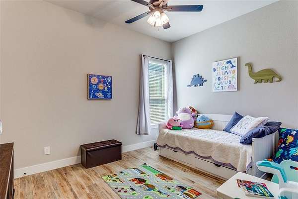 The split-bedroom layout provides privacy for the primary suite, which includes convenient utility room access through the primary closet. Throughout the home, you'll find durable wood-look tile flooring with no carpet, offering easy maintenance and a cohesive, modern feel.