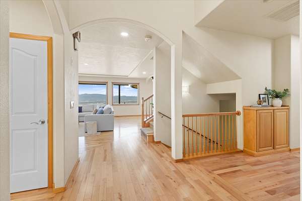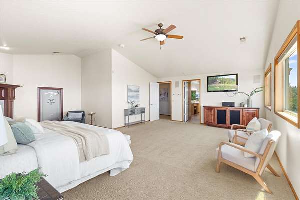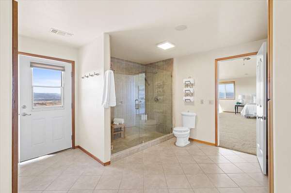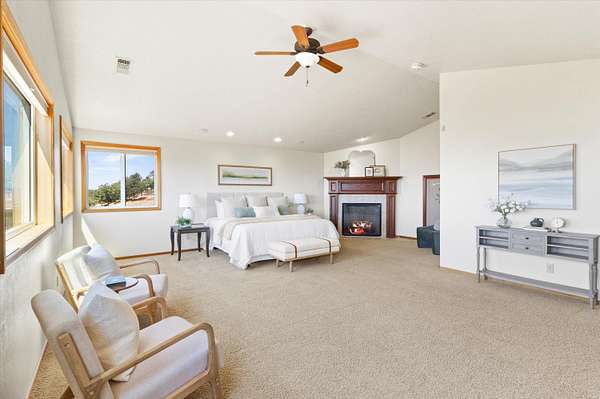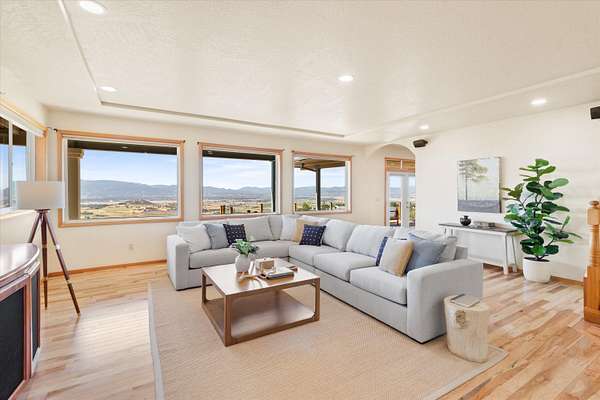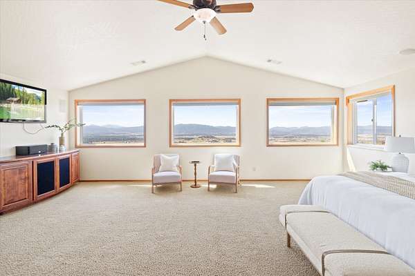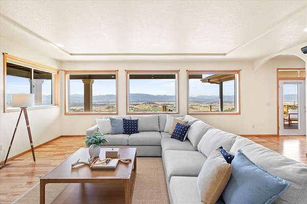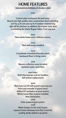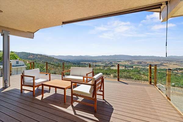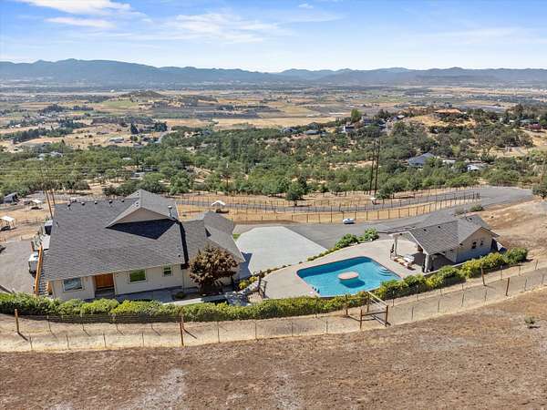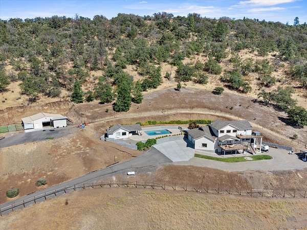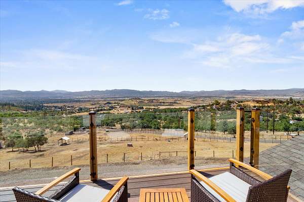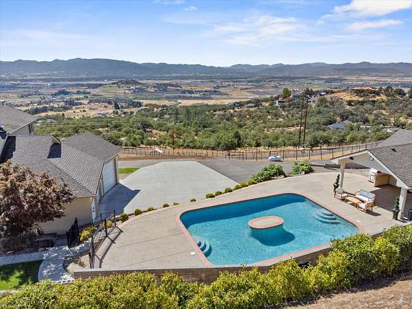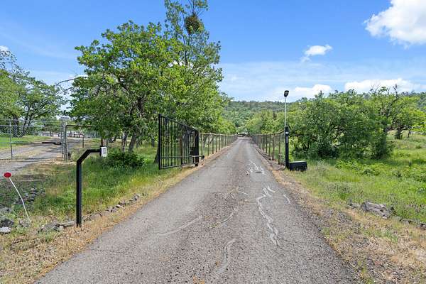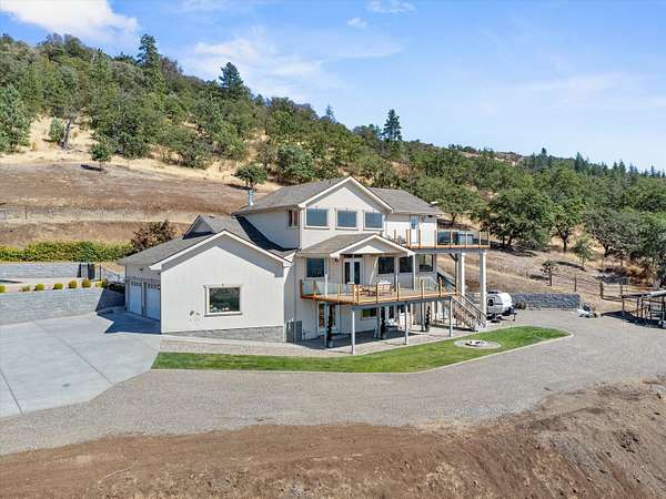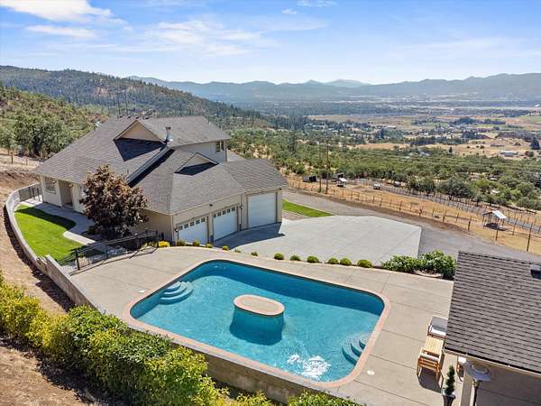 VIEWS VIEWS VIEWS! This private, gated East Medford home offers 4,022 sqft of main home living with breathtaking sunsets and panoramic vistas. The 3-bed, 4-bath with additional office layout is an entertainer's dream. A large balcony and spacious covered patio offer room for entertaining. The 2-car garage and additional RV garage feature vaulted ceilings for abundant storage options. Inside, discover elegant hardwood floors, tray ceilings, and a chef's kitchen with pantry, double ovens, and stainless-steel appliances. The owner's suite is a sanctuary with huge west-facing windows showcasing stunning Rogue Valley views, a private balcony, climate control, hot tub, large fireplace, sauna, and built-in wall safe. Step outside to find a swimming pool with large island, 2 fire pits, plus separate 400 sqft 1 bed, 1 full bath ADU, a barn, spacious workshop, and multiple sheds. Fenced and cross-fenced, making it turnkey for livestock or horses. The land is also fire defensible space managed.
