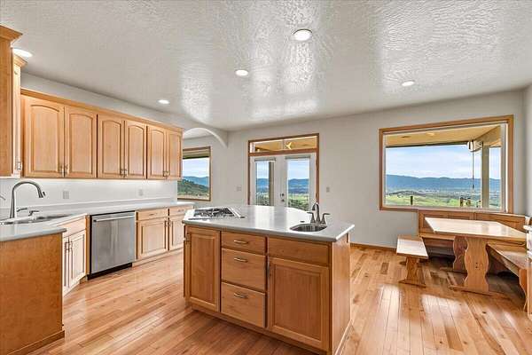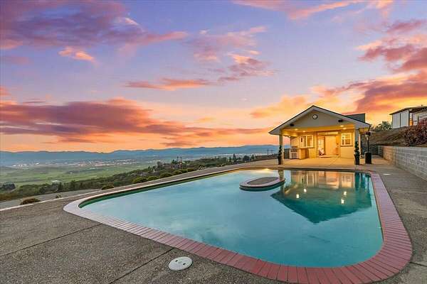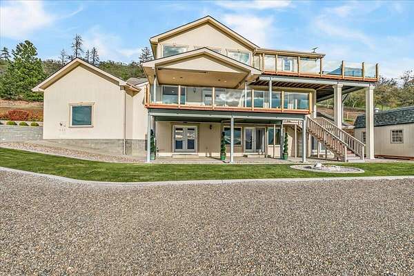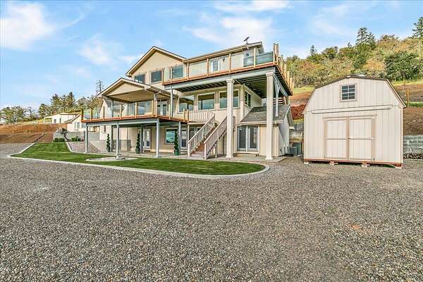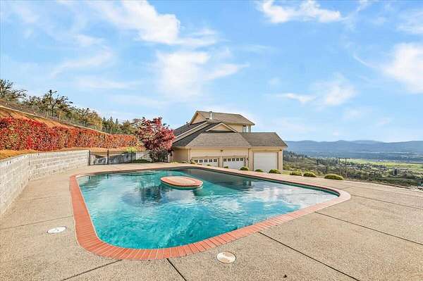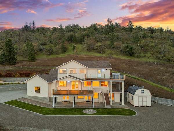 Stunning gated hillside estate in East Medford offering 4,022 sf with a 400 sf guesthouse on 16.25 private acres with breathtaking panoramic Rogue Valley and mountain views. The bright chef's kitchen features oak cabinetry, granite counters, large island with gas cooktop, double ovens, and stainless appliances, flowing into the spacious living room with gas fireplace and dining area. Four bedrooms, five bathrooms, generous walk-in closets, and convenient laundry complete the interior. The luxurious primary suite offers a double vanity, walk-in shower, and private cedar sauna. Outside, enjoy an inground pool, covered outdoor kitchen, hot tub, large shop/barn with loft, detached guest house with kitchen/bed/bath, stone fire pit with sunset views, multiple decks, and fully fenced/cross-fenced pastures ideal for horses or livestock. A rare private hilltop opportunity with easy access to Medford amenities. Contact today for more information!
