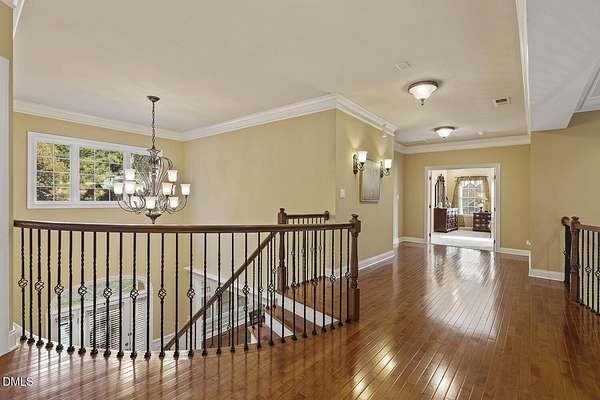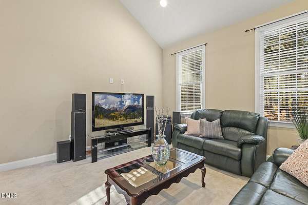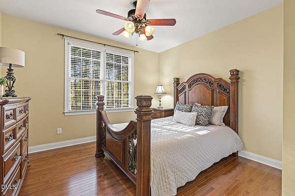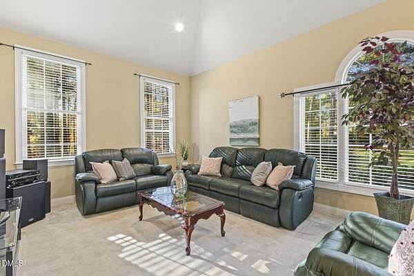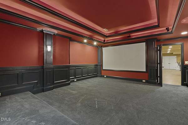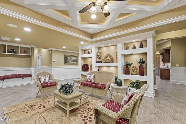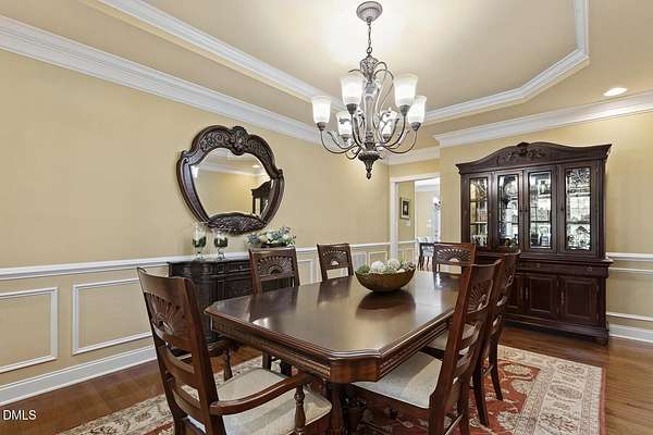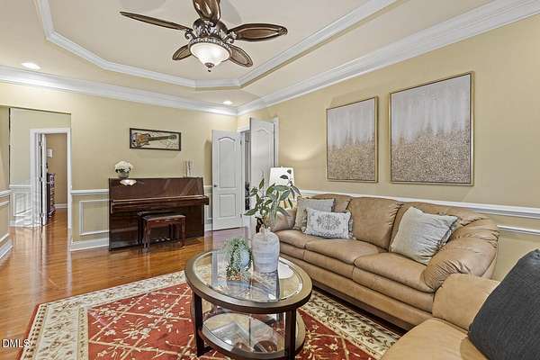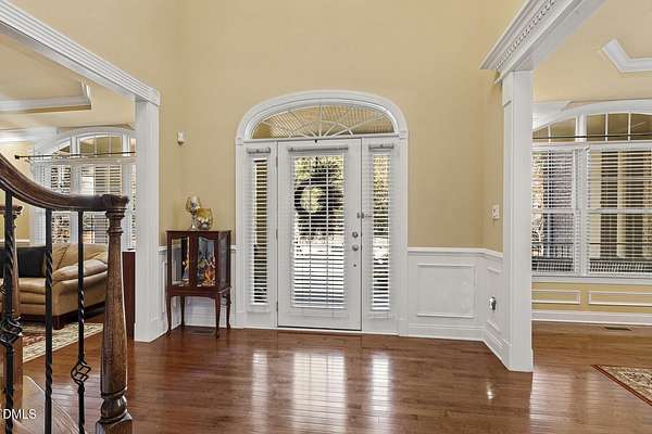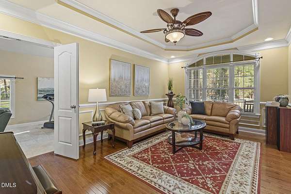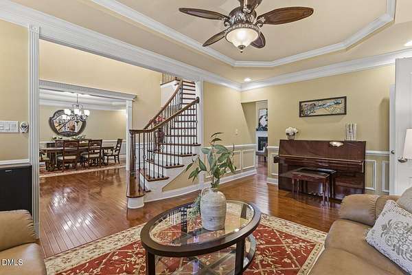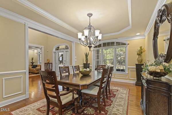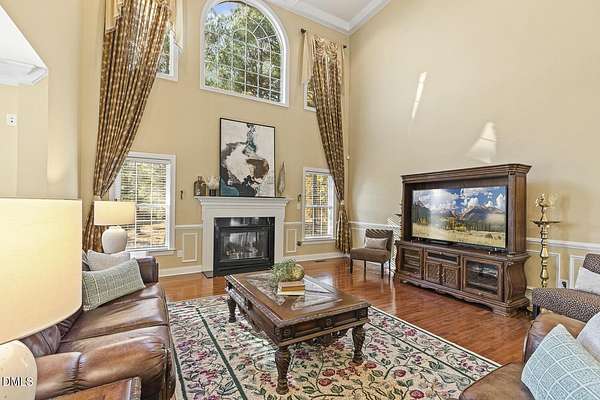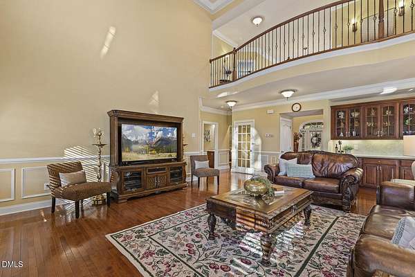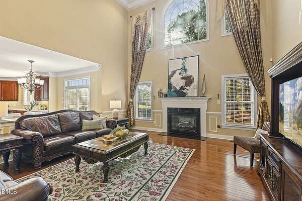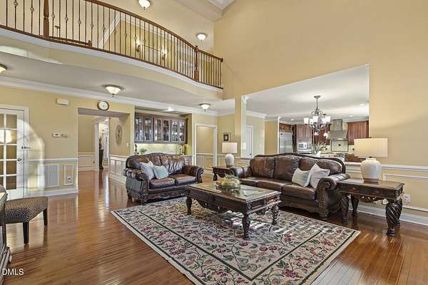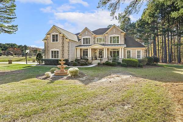 Experience refined estate living on 1.9 private acres in South Raleigh, just moments from Cary and Apex. This 6,977 sq ft custom built residence showcases exceptional craftsmanship, architectural elegance, and expansive living spaces designed for luxury, comfort, and versatility. A grand two-story foyer with a sweeping spiral staircase welcomes you into a home rich with detail. Throughout the main living areas, you'll find heavy custom moldings, including crown molding, trey ceilings, picture-frame molding, and chair rail, all adding sophistication and depth to every room. Elegant formal living and dining rooms set the stage for gatherings, while the impressive two-story family room with coffered ceiling creates a dramatic yet inviting central space. The gourmet kitchen features a Viking refrigerator, professional gas range with hood, abundant cabinetry, and an ideal layout for everyday living or entertaining. The first floor also includes a versatile bonus/office, a meditation room, utility room plus a private guest suite with full bath. Most of the first floor is hardwood flooring. Upstairs, the luxurious primary suite offers a relaxing sitting room, dressing area with three walk-in closets, and a spa-like bath complete with jetted tub, dual vanities, and walk-in shower. A private en-suite bedroom plus two additional bedrooms connected by a buddy bath complete the second level. The fully finished basement expands the lifestyle possibilities, offering a complete second kitchen, dining area, family room, a flexible bedroom/bonus room, full bath, and a dedicated movie theater. This is perfect for multigenerational living, guests, or private entertaining. With nearly two acres of privacy, a three-car garage, circular driveway, and exquisite architectural detailing throughout, this home stands out as a rare luxury opportunity in one of the Triangle's most desirable locations.