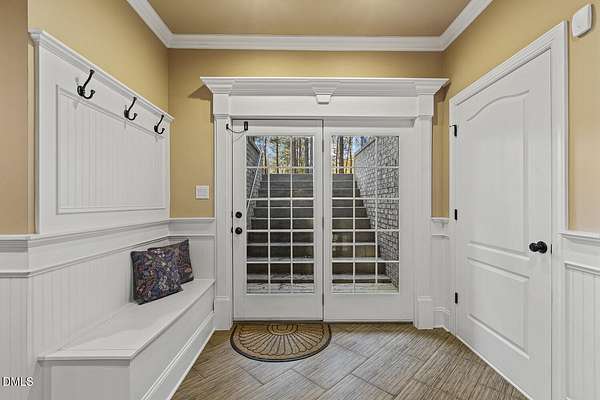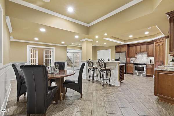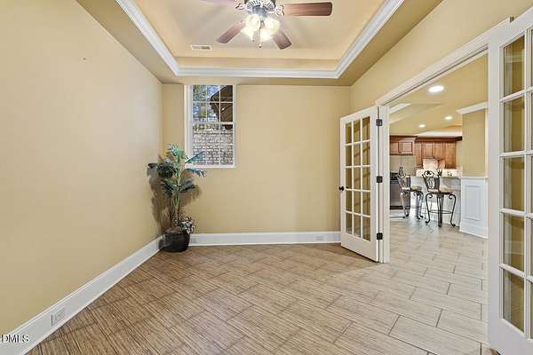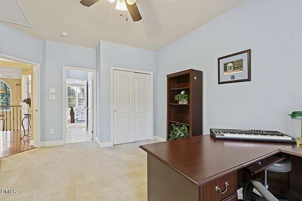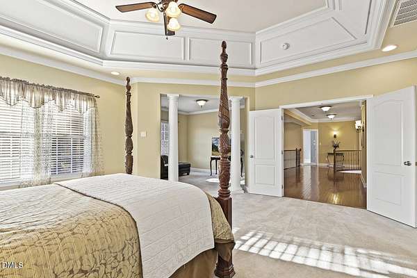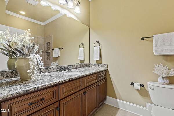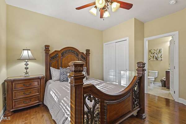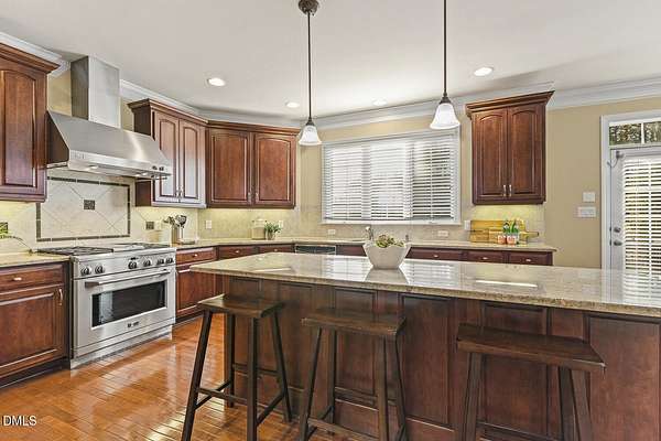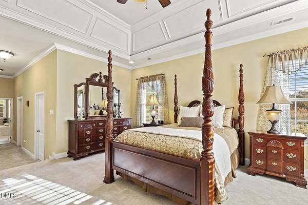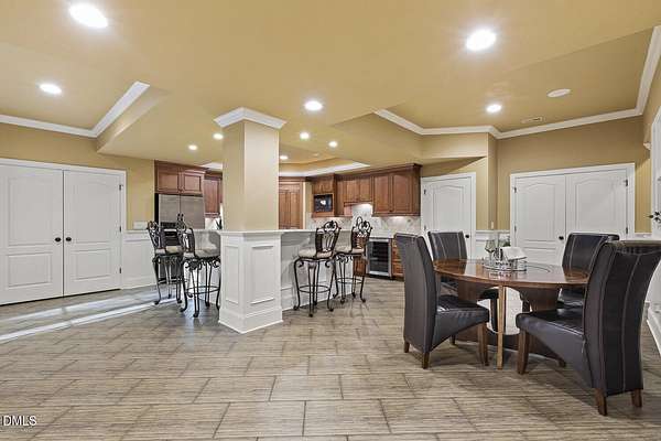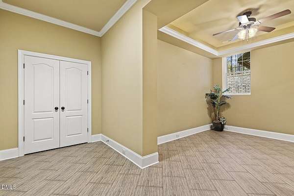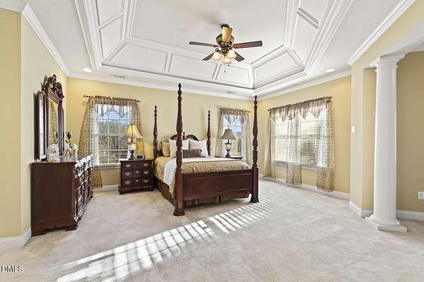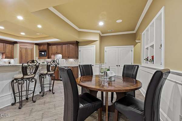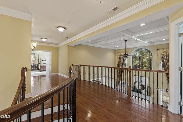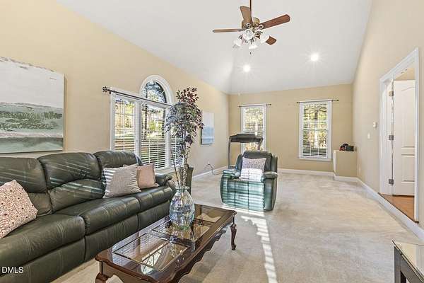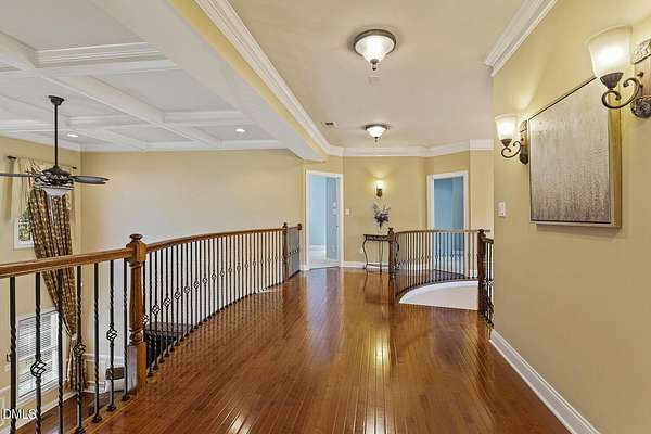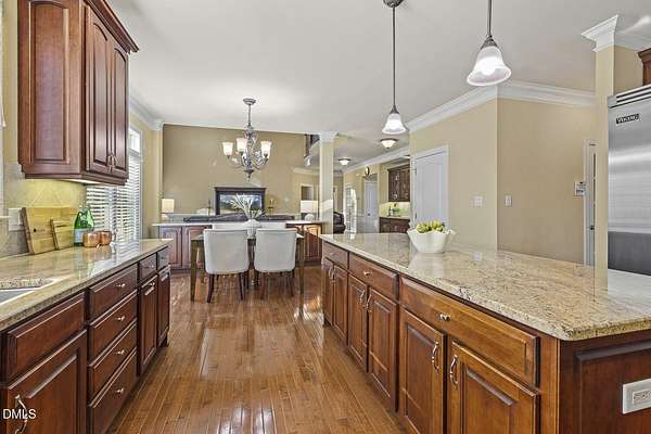 Experience refined estate living on 1.9 private acres in South Raleigh, just moments from Cary and Apex. This 6,977 sq ft custom built residence showcases exceptional craftsmanship, architectural elegance, and expansive living spaces designed for luxury, comfort, and versatility. A grand two-story foyer with a sweeping spiral staircase welcomes you into a home rich with detail. Throughout the main living areas, you'll find heavy custom moldings, including crown molding, trey ceilings, picture-frame molding, and chair rail, all adding sophistication and depth to every room. Elegant formal living and dining rooms set the stage for gatherings, while the impressive two-story family room with coffered ceiling creates a dramatic yet inviting central space. The gourmet kitchen features a Viking refrigerator, professional gas range with hood, abundant cabinetry, and an ideal layout for everyday living or entertaining. The first floor also includes a versatile bonus/office, a meditation room, utility room plus a private guest suite with full bath. Most of the first floor is hardwood flooring. Upstairs, the luxurious primary suite offers a relaxing sitting room, dressing area with three walk-in closets, and a spa-like bath complete with jetted tub, dual vanities, and walk-in shower. A private en-suite bedroom plus two additional bedrooms connected by a buddy bath complete the second level. The fully finished basement expands the lifestyle possibilities, offering a complete second kitchen, dining area, family room, a flexible bedroom/bonus room, full bath, and a dedicated movie theater. This is perfect for multigenerational living, guests, or private entertaining. With nearly two acres of privacy, a three-car garage, circular driveway, and exquisite architectural detailing throughout, this home stands out as a rare luxury opportunity in one of the Triangle's most desirable locations.
