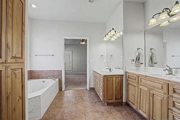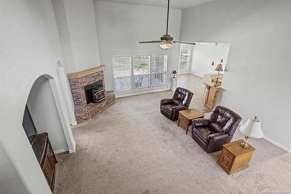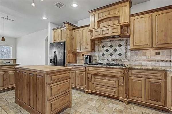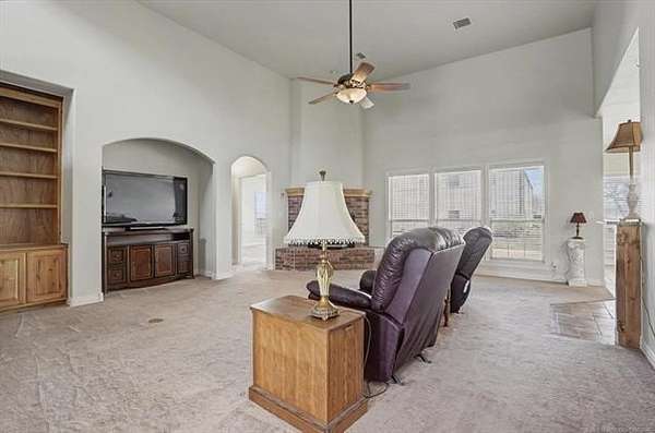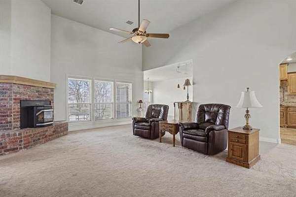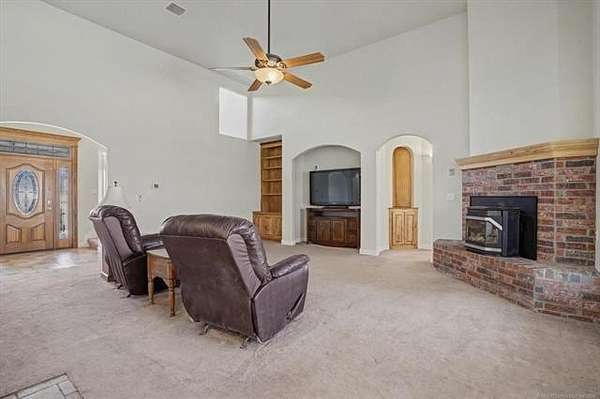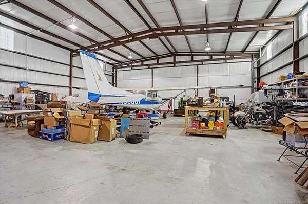 Located on the north taxiway in Skyhaven Airpark (OK01), this property offers direct runway access from a 50 x 85 fully insulated hangar-ideal for aircraft owners, hobbyists, or anyone needing exceptional storage or workspace. Inside, the home features two first-floor primary suites, each with custom en-suite baths, walk-in tiled showers, and spacious closets. The main suite adds a spa tub, dual vanities, and an oversized walk-in closet. The interior has just been freshly painted in a neutral color palette, creating a bright, move-in-ready feel throughout. Extra-wide doorways, arched openings, and generous storage enhance comfort. The gourmet kitchen includes custom alder cabinetry with pull-outs, granite counters, tumbled-tile backsplash, butcher-block island with wine fridge, Kenmore Elite oven/microwave, and a Jenn Air 45" gas cooktop with griddle and downdraft vent. The living room offers 14-ft ceilings, built-ins, and a pellet stove. Upstairs is an oversized game room with wet bar and custom cabinetry. A 6-person steel safe room, full alarm system for house and hangar, 2024 hot water tank with recirculation, and 3-car garage with wind-load doors provide added peace of mind. Outdoor features include a covered patio with gas shutoff and hot tub hookup, Ameristar steel fencing, and mature trees. The 50 x 85 metal hangar, built by Jim Cain, includes 18-ft sidewalls, guttering, post-tension slab, welded construction, separate electric and water, two workshop areas, garage door, RV-height door, and hydraulic hangar door. Permanent stairs lead to a 25 x 50 floored loft. Bathroom has plumbing and an unfinished shower. This one-of-a-kind Skyhaven Airpark property blends aviation access, custom design, privacy, and utility-an outstanding opportunity for pilots or those who value space and amenities.