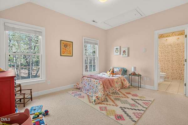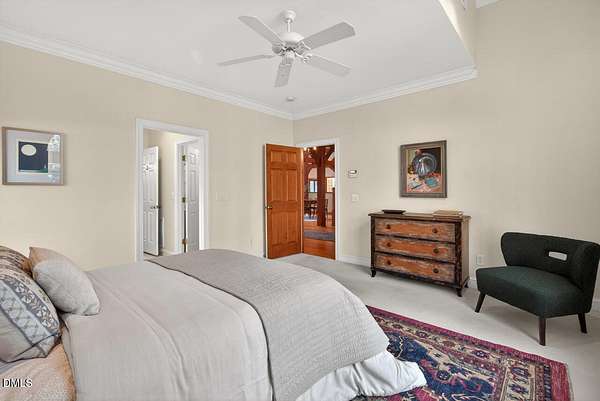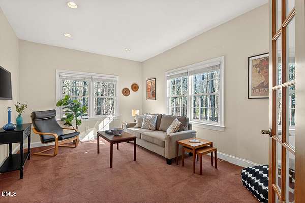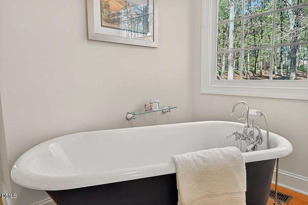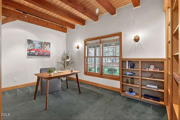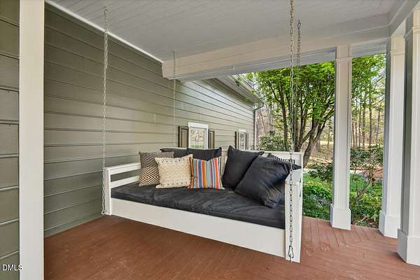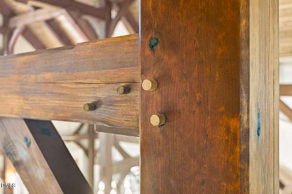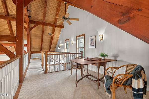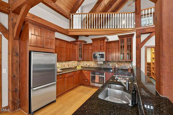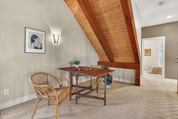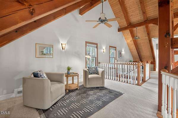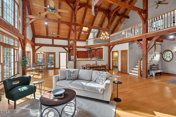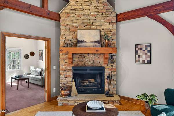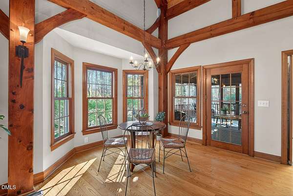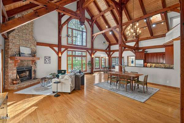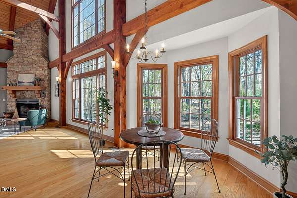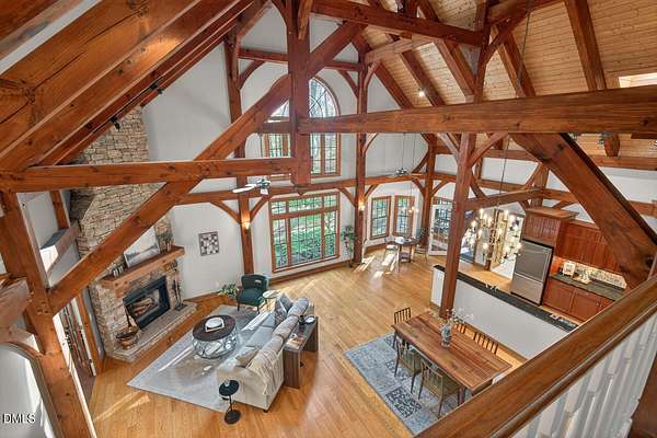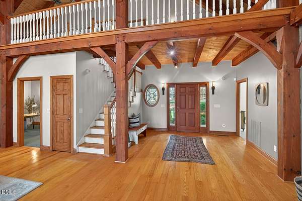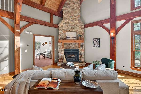 This stunning 3709 square foot timber-frame home is situated on a 2.84 acre private wooded lot in the friendly Tyndrum neighborhood. Bordering the stunning 12-mile trail system of Duke Forest, the property offers a lifestyle that is deeply connected to its natural setting. Combining mortise and tenon joinery (timber-frame) in the central living areas with traditional frame construction for the additional rooms, creates a living area that offers a graceful balance of openness and intimacy, providing both structural integrity and visual drama. The first floor is anchored by the dramatic great room with soaring 39-foot ceilings and pristine oak flooring. The immense great room windows fill the primary living space with natural light and forest views of southern and western exposures. The central living space includes a large seating area in front of the floor-to-ceiling wood burning fireplace, a large open dining room is flanked by a gorgeous kitchen w/endless cherry cabinets and granit counters. A separate food prep kitchen w/refrigerator, sink, large pantry and laundry room resides just behing the primary kitchen making entertaining effortless. The breakfast nook and screened porch provide complementary space. This is first-floor living at its best. Additional rooms include a primary bedroom with 2 walk-in closets, bathroom w/soaking tub and views of the forest, a library (or office) surrounded by floor-to-ceiling built-in natural shelves and a TV/den room with a half bath. The second floor features 2 en-suite bedrooms w/large closets. Two open space lofts overlook the first floor great room and can be used for TV space, office, crafts or a game room. The spacious 22' x 13' bonus room is perfect for recreation and exercise in addition to serving as a 4th bedroom; it also enjoys the largest storage room in the house. The oversized yard provides the privacy of one-acre on each side of the house. The front yard is beautifully landscaped, and the front porch captures the morning sun and is a frequent place to talk with neighbors, which is the sellers favorite feature. The back porch benefits from the afternoon sun, serving as a private retreat. The rear and side yards are low maintenance. Gardening is ideal in the raised garden frames behind the house. The house features a large two-car garage with a built-in electric vehicle charging station. The front of the neighborhood is flanked by 2 lovely ponds on either side of the entrance.