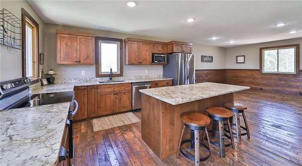 Experience the ultimate blend of luxury and nature at this impeccably remodeled 3-bedroom, 2-bathroom home, nestled on 10 breathtaking acres. This stunning property, just about 15 minutes from Cross Lake, Nisswa, and Pine River, offers a serene escape with modern amenities and high-end finishes. The main level features a luxurious primary ensuite including walk in closet, shared bath, and laundry. Experience the open-concept kitchen, dining and living space with hardwood flooring, custom knotty alder cabinets and built ins, and granite countertops. Large windows frame picturesque views of the surrounding landscape, inviting the beauty of nature inside. Retreat downstairs to your expansive family room for more fun or relaxation. 2 additional bedrooms and a bath down as well. newly completed exterior siding, LP SmartSide. Embrace the tranquility of this nature lover's paradise, huge 45x30 pole shed and boasting 4.5 acres of high ground, gentle rolling hills, and a peaceful meadow overlooking Spring Brook. Enjoy striking sunsets as the brook meanders through the west side of the parcel, creating an enchanting backdrop for your new home. Schedule a private showing and discover the allure of this exquisite retreat. 13 additional acres to the north available for purchase (6680788)
