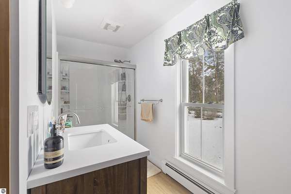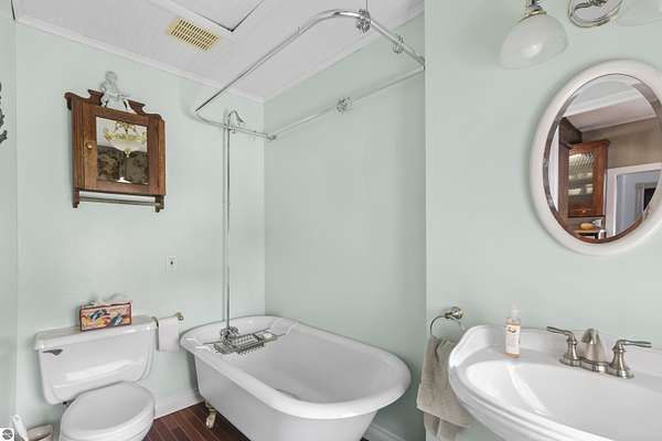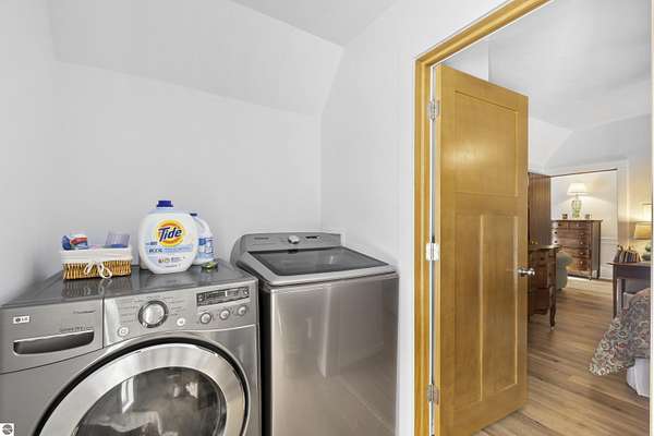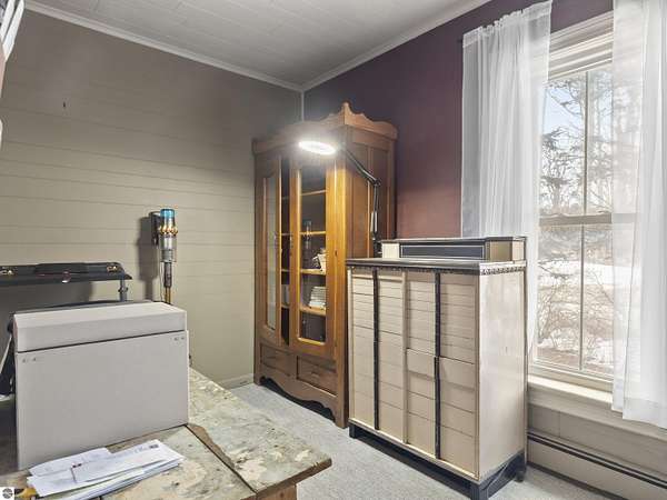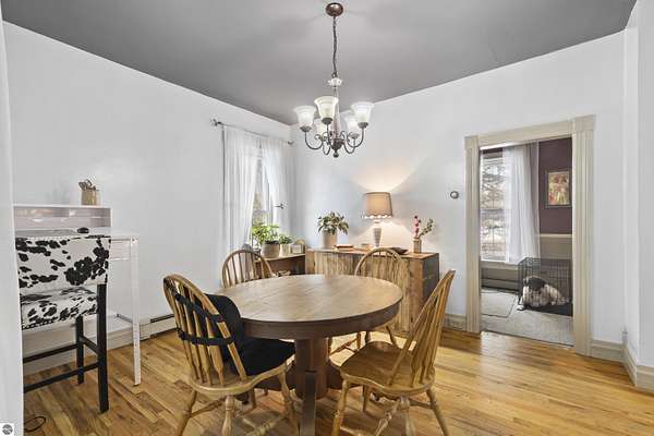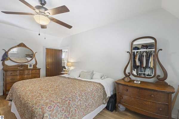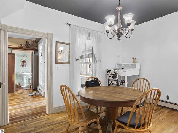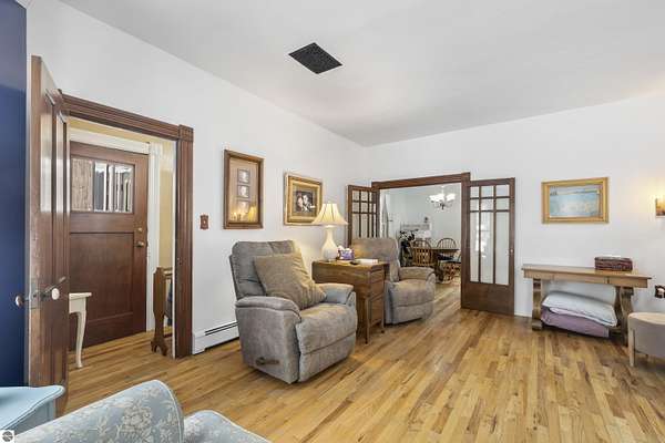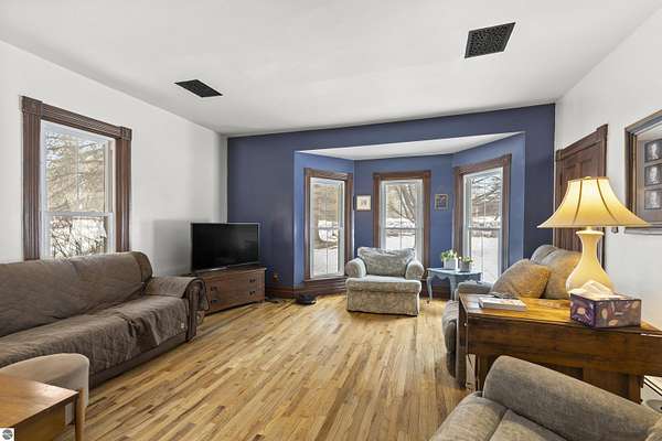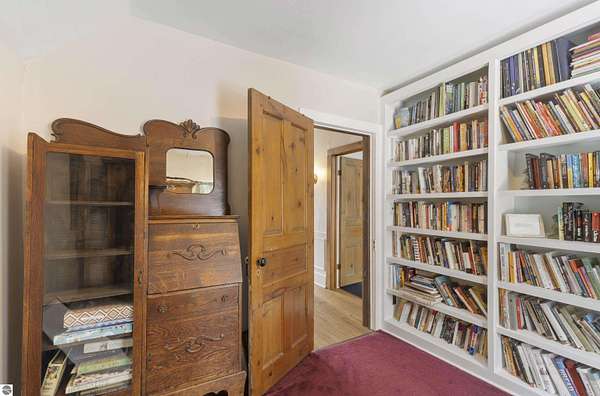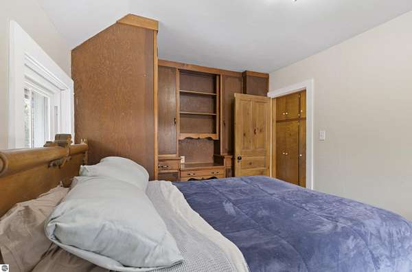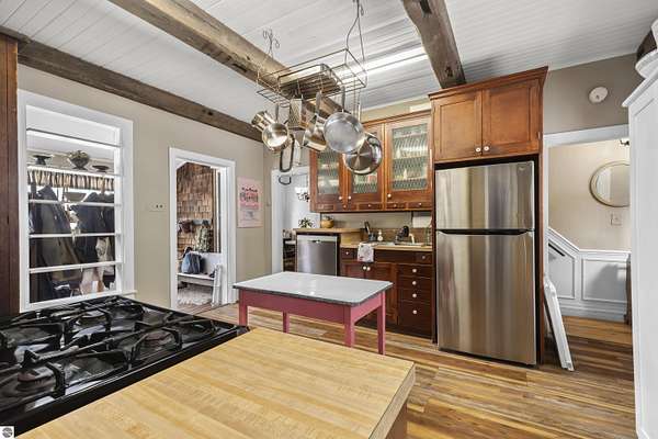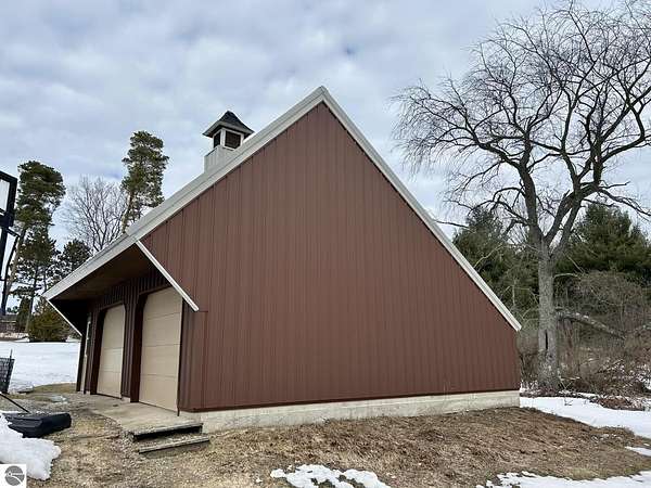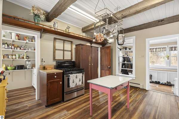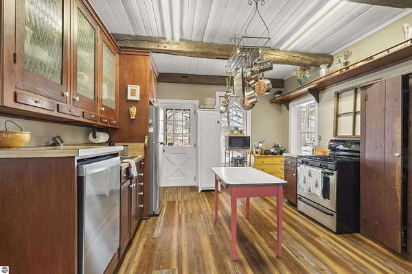 Charming, extensively updated 1886 farmhouse and detached two-car garage on 5.5 countryside acres. Just 3.5 miles to Lake Michigan sandy beaches. The seller says this is the site of the historic Fredrickson Tulip Farm. Dutch tidiness is evident in the many built-in cupboards and shelves found inside the home and in the placement of shrubs and flowers in the landscaped yard. The spacious farmhouse features 4 bedrooms and 2 full baths, a formal dining area, small office, large loft sitting area, walk-in pantry off the kitchen, an enclosed porch/mudroom and a 500 sq. ft basement for storage. The primary bedroom was updated in 2023 and has its own bath with a 5 ft. long shower enclosure and a washer dryer. This home wonderfully blends farmhouse character of yesteryear with modern amenities. There is nothing like authentic, original plaster lathe walls and ceilings, and the warmth of original wood floors and woodwork. A set of French doors and a clawfoot bathtub with showerhead add touches of charm. Interior upgrades include the replacement of all windows, newer vinyl plank flooring, stainless appliances, hot water baseboard heat an updated electrical panel and updated water heater. For low maintenance, the exterior of the home was updated to include vinyl shake siding and a steel metal roof the garage has metal siding and a newer metal roof. Interior stairs in the garage lead to a large, unfinished loft that could make a great studio or extra sleeping space. Natural gas supplies the house and a pipe to the garage was run for future use. The original wooden shed is large and needs a new roof. The yard is big, with container and flower gardens, dog kennels and a pen, a small deck, a chicken coop/garden area, firepit, and some woods with a walking path. Bonus: approx. 1 acre of invisible fencing. Village amenities are found in Benzonia, Elberta or Frankfort. The nearby Betsie River is known for great fishing, kayaking and birding.