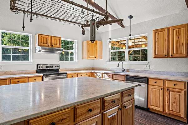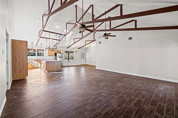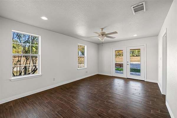 This is a very unique property. The home is located on a private court. Each property in the subdivision is on acreage and is immaculately maintained. There are only about seven houses on the entire court. Beautiful and private, the lot is just under seven acres with your very own water well. The home boasts wonderful porches across the front and back of the house. It is the perfect place to entertain. You enter the house into a great room, island kitchen, dining area and den. Down the hall you will find two bedrooms and two bathrooms. The primary bedroom has a very large walk-in closet. There is a nice utility room with built-ins. Covered parking available for up to four vehicles as well.