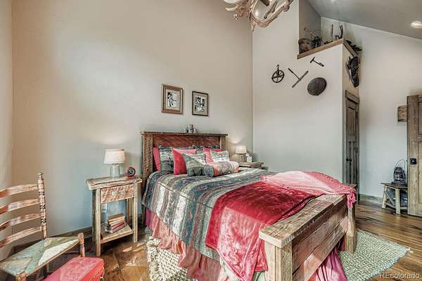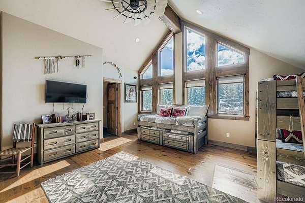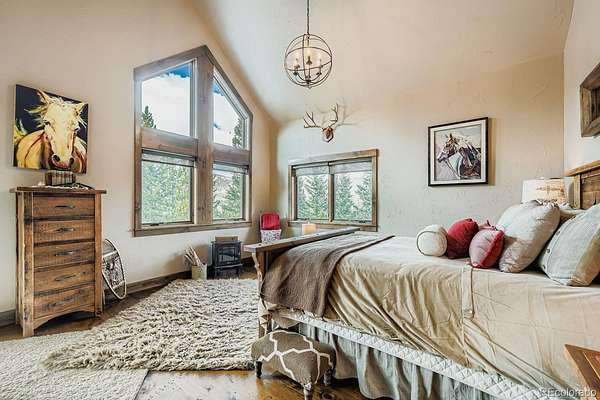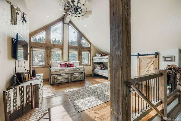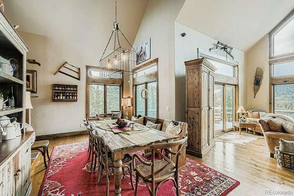 Rare New England pine floors anchor the interior, complimented by authentic moose and elk antler chandeliers as well as windmill-style ceiling fans that add architectural presence while honoring the surrounding alpine setting.