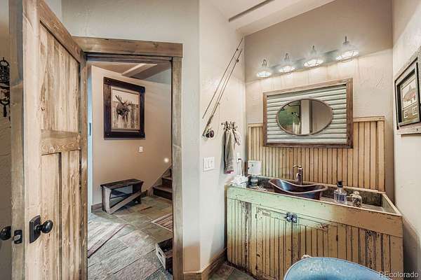 The exterior of the home possesses a beetle-kill siding framed with galvanized metal accents, blending rugged mountain durability with timeless design. Inside, you’ll find rich mountain inspired textiles including Mexican soapstone surfaces texturizing charm, while unique antique vanities replace the expected, offering one-of-a-kind character in lieu of the ordinary.