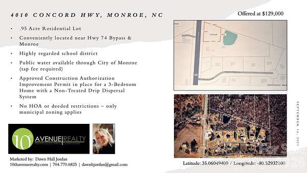 Est $937/mo1-acre lot conveniently located near the Hwy 74 Bypass and Monroe, within a highly regarded school district. Public water available through the City of Monroe (tap fee required). An approved Construction Authorization Improvement Permit is already in place for a 3-bedroom home with a Non-Treated Drip Dispersal System. Please refer to attached documents for details. City of Monroe information can be found. Refer to page 103 for utility connection. No HOA or deeded restrictions. Building restrictions would only apply to municipal building zoning requirements.
