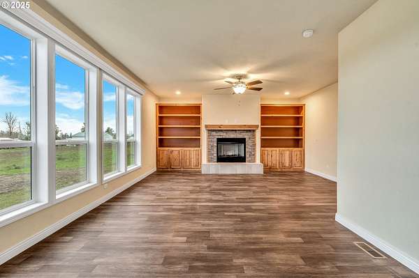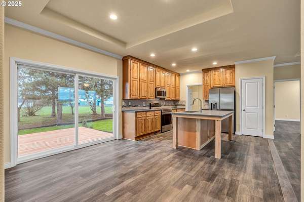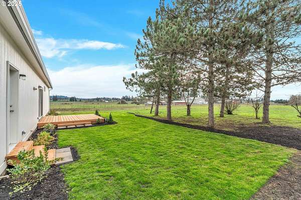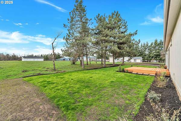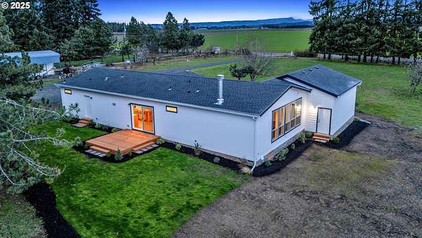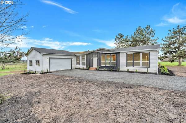 This flat 5-acre property offers an exceptional opportunity for peaceful living with room to grow. This fully fenced lot is perfectly flat and has all new gravel, driveway and gate. It features a brand new Golden West Home, 2025 manufactured home that is pit set on a poured concrete slab. It is 1836 sqft and has a 24x24 ft garage, 3 bedrooms and 2 bathrooms, showcasing a beautiful design and a spacious kitchen with high-quality appliances. An open-concept layout connects the kitchen, dining, and living areas, while sliding doors from the dining room lead to a back deck, perfect for indoor-outdoor living. Oversized windows throughout fill the home with natural light. The primary suite includes an ensuite bath with double sinks. Spacious family room features a wood burning fireplace. Outside, enjoy a huge yard with all new landscaping, a large outbuilding with new roof and electrical. New well house serviced this year and septic system. Back yard is well maintained, muddy part is seed planted to match grass.