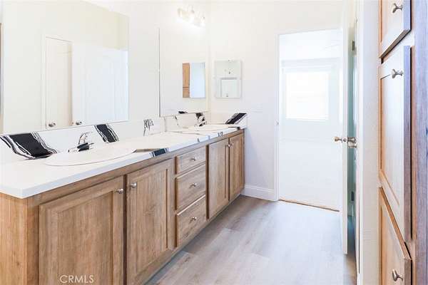 Inside, the home features an open great room with beautiful laminate floors, a large kitchen with custom quartz countertops, a generous island with seating for three, and rich cabinetry. Stainless steel appliances include a gas cooktop, dishwasher, microwave, and a large black sink. Two secondary bedrooms share a full bath with a large soaking tub. The primary suite at the rear of the home offers a walk-in closet, a second reach-in closet, and a spa-like ensuite with dual vanities and a walk-in shower. Just outside the primary is a large laundry room with upper cabinetry and bonus storage space, plus an exterior door leading directly to the backyard.