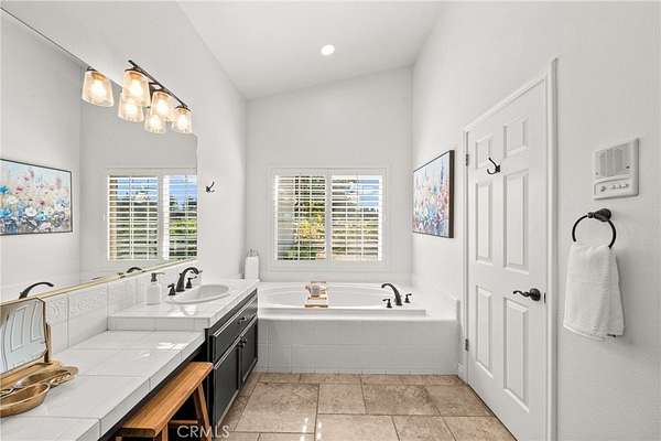 The luxurious primary suite features vaulted ceilings, a large walk-in closet, and a spa-style bathroom with dual vanities, a Jacuzzi soaking tub, and a walk-in shower--all with sweeping views just beyond the window.