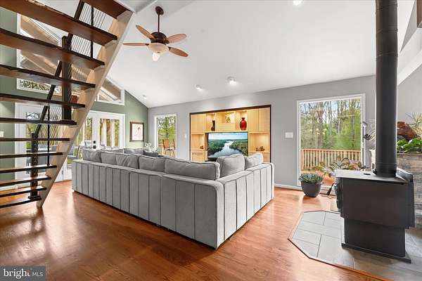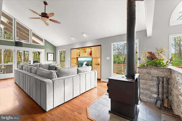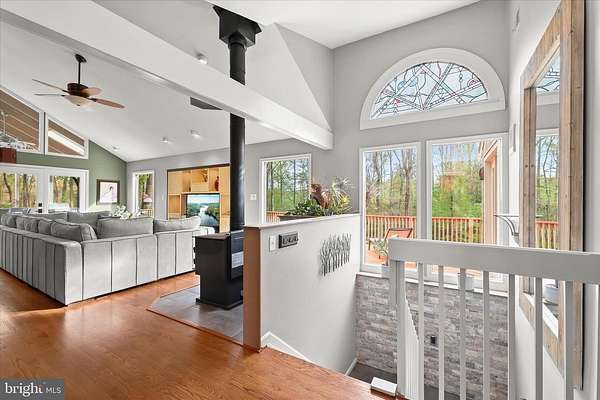 Stunning contemporary home nestled on a quiet cul-de-sac in the sought-after The Heritage community set on a premium 3.3-acre homesite backing to woods and farmland with breathtaking, picturesque views framed by soaring vaulted ceilings and dramatic floor-to-ceiling windows, while the upgraded walkout lower level offers a full bath and potential fourth bedroom. The open-concept living and dining areas showcase refinished hardwood floors, walls of glass, and a striking wood-burning stove set against a custom stacked-stone accent wall. A live-edge wood staircase leads to a loft, ideal for a home office or creative retreat. The custom-designed gourmet kitchen features rich wood cabinetry, stainless steel appliances, an upgraded induction cooktop, an oversized island breakfast bar, and a stunning herringbone tile backsplash. The adjoining breakfast room opens to the screened porch surrounded by floor-to-ceiling windows and panoramic skyline views. The primary suite is a true sanctuary, highlighted by updated French doors, exquisite inlaid hardwood flooring, a walk-in closet, and frosted French doors leading to a luxurious spa-inspired bath. Rich wood cabinetry, designer tilework, a corner soaking tub, an oversized frameless shower, heated tile floors, and a heated towel rack continue the home's elevated design. Two additional hardwood-floor bedrooms and a beautifully appointed hall bath complete the main level. A stacked-stone staircase leads to the refinished lower level. The finished lower level features a generous living area with direct access to the patio and backyard, a full bath, a versatile bonus room or potential fourth bedroom, and a mudroom with convenient entry to the garage. Outdoor living feels like a private retreat with a partially fenced yard, hot tub, dedicated fire pit area, surrounding bike trails, a nearby stream, and unforgettable views in every direction. An oversized finished 2.5-car garage includes an exercise area with mounted TV, finished flooring, drywall, lighting, and built-in storage. Additional highlights and recent upgrades include a surround sound speaker system, radon mitigation system, 2021 roof, two new hot water heaters (2021), new well pump (2021), 2025 pH water balancer, and 2025 hot tub updates including new control panel, salt system, and cover.