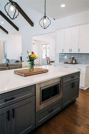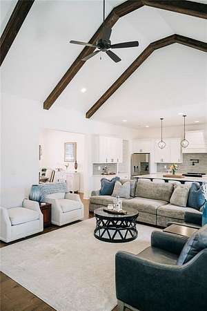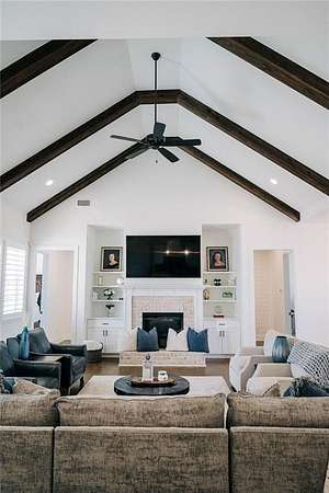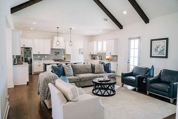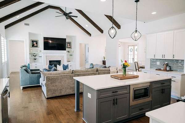 The large open-concept living area serves as the heart of the home, featuring vaulted ceilings accented with wood beams and a fireplace, creating a cozy yet refined atmosphere. This space flows seamlessly into the kitchen, which boasts a large center island with seating for four, natural stone and wood finishes, and a spacious walk-in pantry, making it ideal for both everyday living and entertaining. A traditional dining room adds elegance, while the laundry room is equipped with custom cabinetry and a utility sink for added convenience.