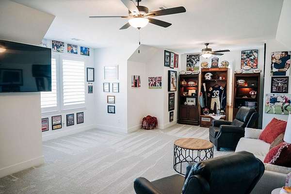 Additional upgrades and features include interior blinds throughout, a security system, and a custom steel built-in storage system in the garage, along with wood, tile, carpet, and natural stone flooring; an electric heat pump HVAC system; a tankless water heater; electric and masonry fireplaces; an irrigation system; and ample storage throughout.