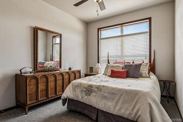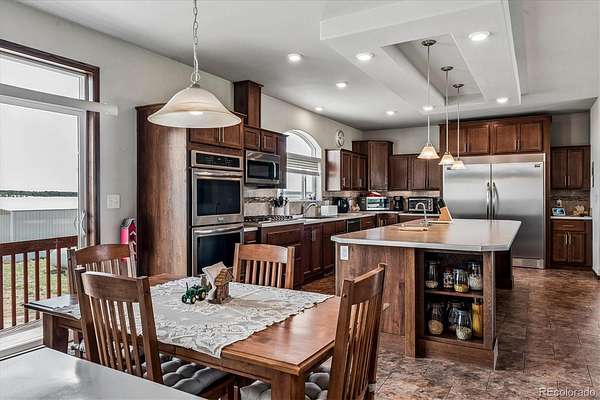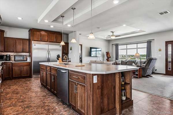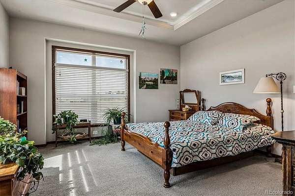 Built in 2018, this home features 9 ft ceilings on both levels, wide doorways in most rooms, and a ramp for easy accessibility. The spacious eat-in kitchen hosts a large center island, oversized refrigerator, double oven, and two dishwashers which is ideal for cooking and entertaining. The primary suite showcases an alcove ceiling, a five-piece bath, and a luxurious sunken tub, all while taking in the stunning Pikes Peak views.