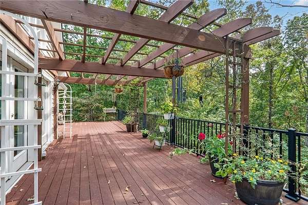 Natural light floods through NEW WINDOWS, ATRIUM DOORS, and SKYLIGHTS, filling every room with warmth. The VAULTED CEILING and PALLADIUM WINDOW make the GREAT ROOM a true focal point, centered around a MASONRY FIREPLACE and BUILT-IN BOOKSHELVES. In the SUNROOM, three SKYLIGHTS brighten the vaulted ceiling. The RENOVATED KITCHEN features granite counters from Brazil, a pearl backsplash, CUSTOM CABINETS with pull-outs, and a full SPICE WALL. The MASTER BATH offers a 6FT JACUZZI TUB framed by a BAY WINDOW. Step out to a 45' x 12' COMPOSITE DECK with sleek aluminum railings and a shaded patio below.