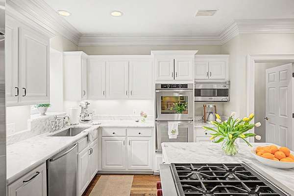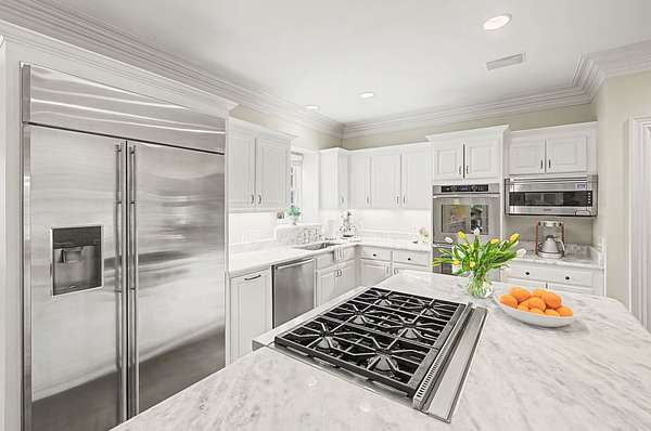 - Built-In Electric Oven, Cooktop, Dishwasher, Disposal, Double Oven, Gas Range, Microwave, Refrigerator, Stainless Steel Appliance(s)