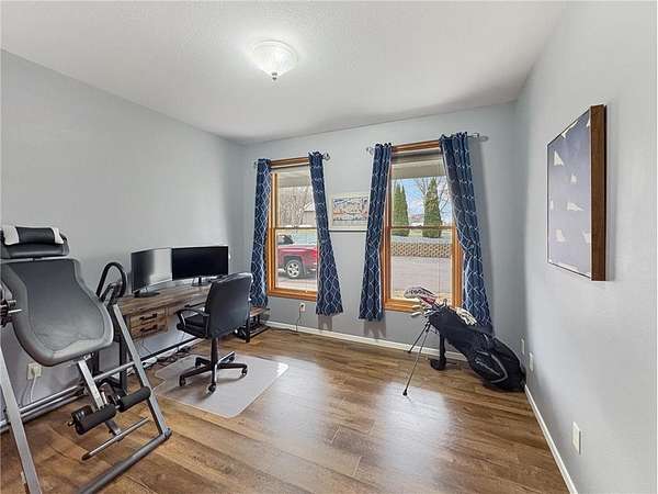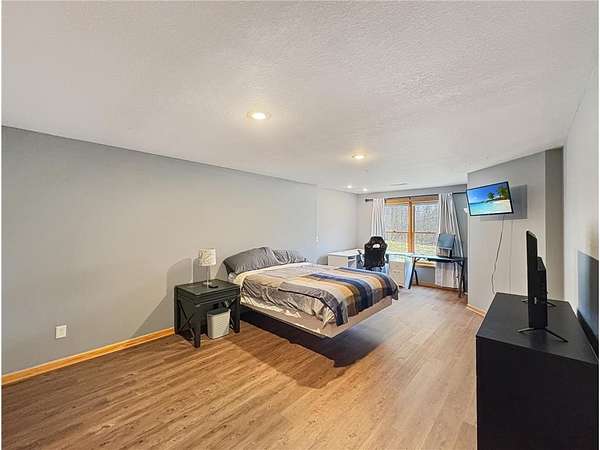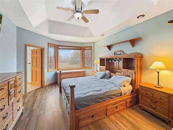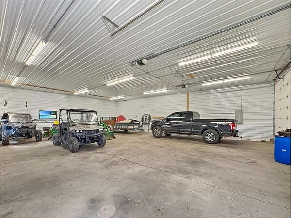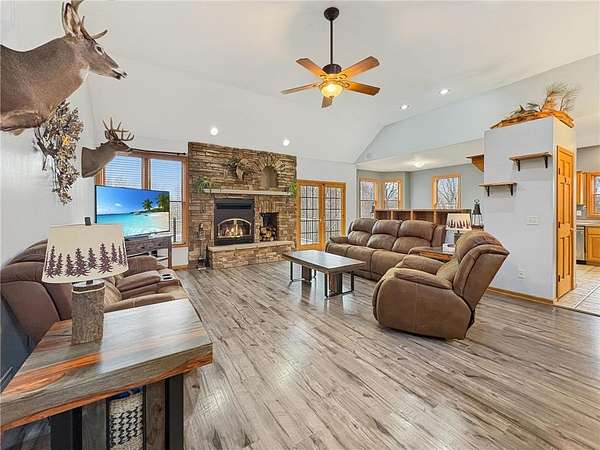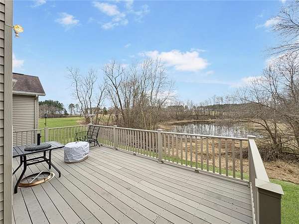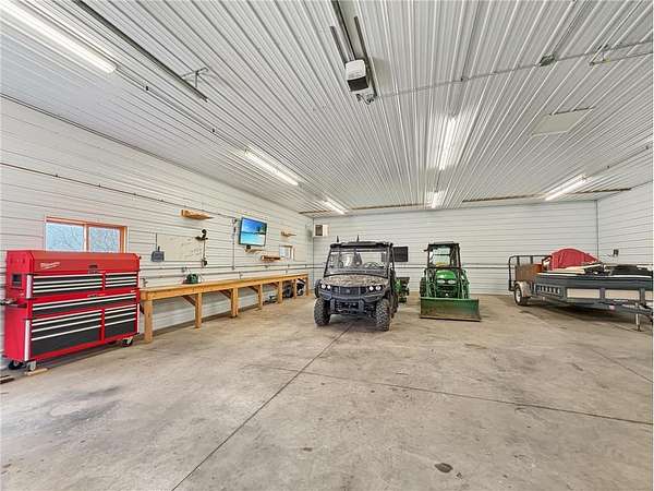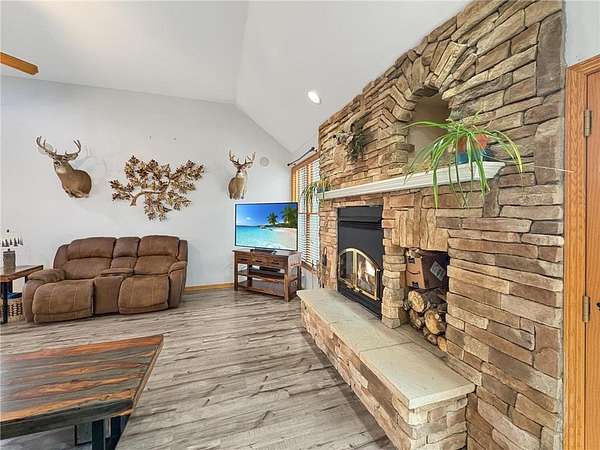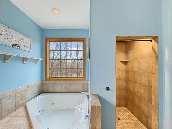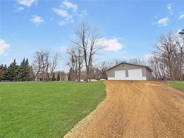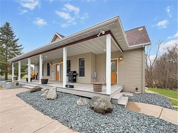Custom-built 5-bedroom, 3-bath home on 4.24 private acres in Milltown, just over an hour northeast of the Twin Cities. With over 4,300 finished square feet, soaring 10-ft ceilings, and 12-ft ceilings in the main living area, this home lives as large as it looks. True main-level living with the primary suite, laundry, and full bath all on the main floor. The primary bath features a jetted tub, walk-in shower, and private walk-in closet — a genuine retreat at the end of the day. Stay cozy year-round with in-floor heat, a wood-burning fireplace, and central air.