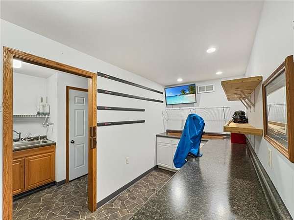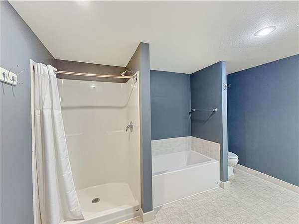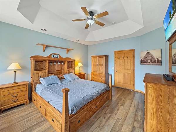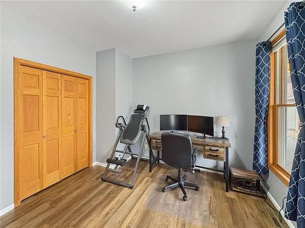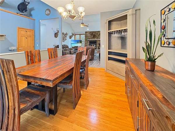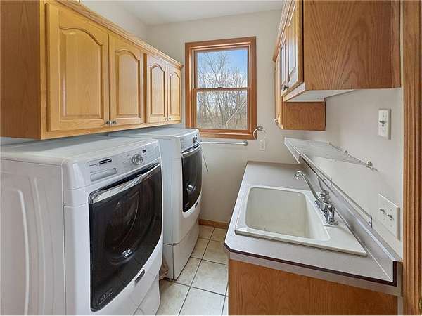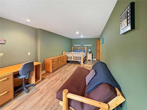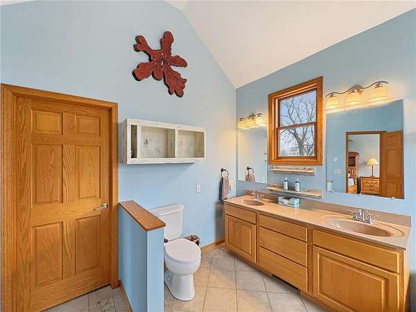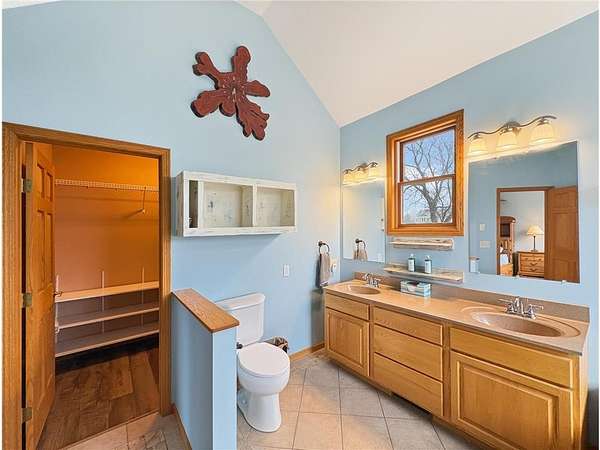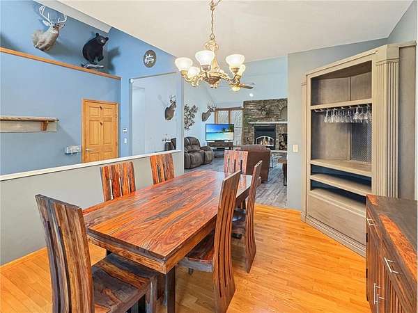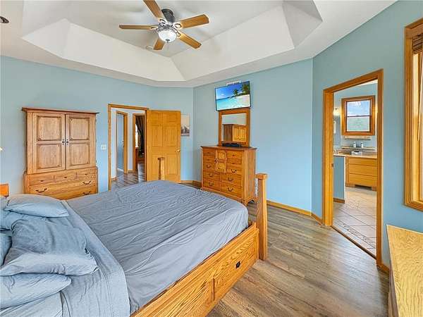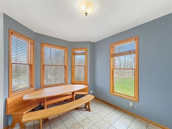 Custom-built 5-bedroom, 3-bath home on 4.24 private acres in Milltown, just over an hour northeast of the Twin Cities. With over 4,300 finished square feet, soaring 10-ft ceilings, and 12-ft ceilings in the main living area, this home lives as large as it looks. True main-level living with the primary suite, laundry, and full bath all on the main floor. The primary bath features a jetted tub, walk-in shower, and private walk-in closet — a genuine retreat at the end of the day. Stay cozy year-round with in-floor heat, a wood-burning fireplace, and central air.