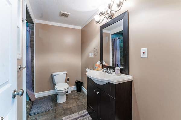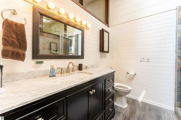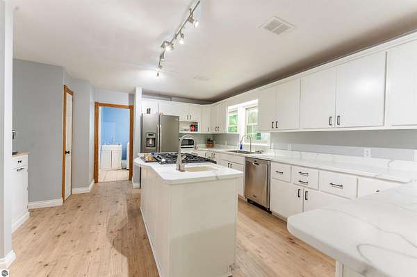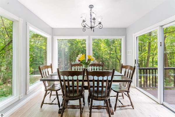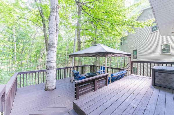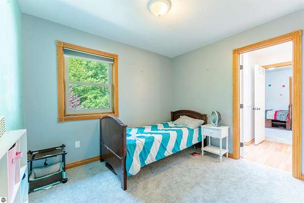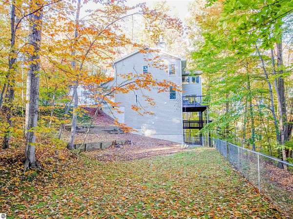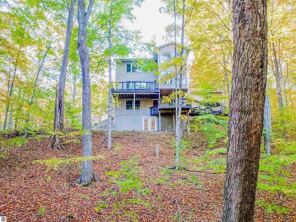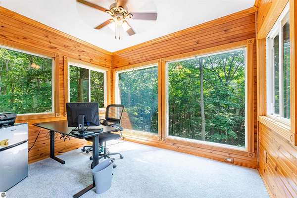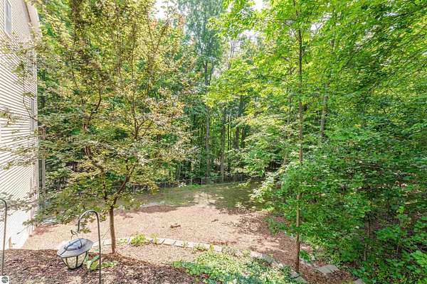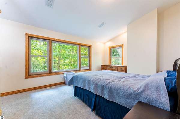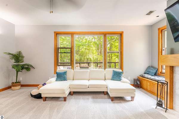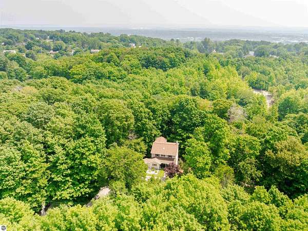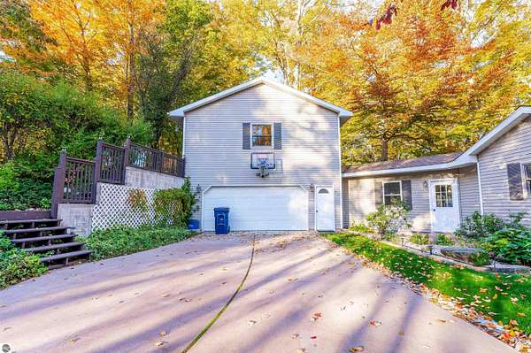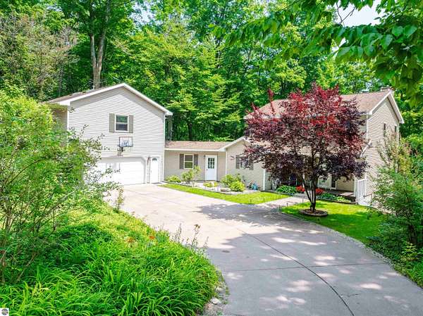 This inviting two-story home blends classic comfort with modern updates, set against a backdrop of mature trees that provide privacy and natural beauty. The exterior features neutral-toned siding with crisp white trim and a welcoming covered front porch, perfect for relaxing or greeting guests. Inside, you'll find four spacious bedrooms and three and a half bathrooms. New carpet throughout creates a fresh and comfortable feel in every room. Large windows fill the interior with natural light, while the surrounding greenery offers a serene and secluded feel. This property combines practicality, charm, and a prime location. The primary bedroom includes its own attached sitting room or private office, offering a peaceful retreat for work or relaxation. A wide concrete driveway leads to a spacious attached two-car garage with a bonus living space above, which has most recently been used as a guest suite and has its own parking and entrance, kitchen, bathroom, and living space. Situated on two private acres, this home offers both space and convenience. It's located just minutes from Traverse City, Munson Medical Center, and local schools, making it the perfect balance of peaceful living and easy access to everything you need. New roof on most the home in 2025. In-Law suite 625 SF not included in SF or 4 bed/3.5 bed description in listing data.