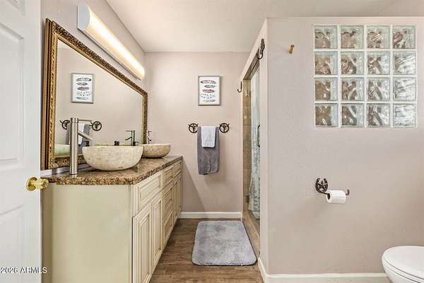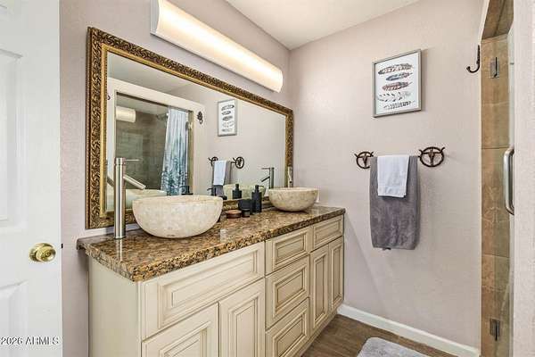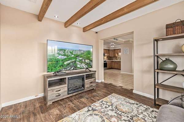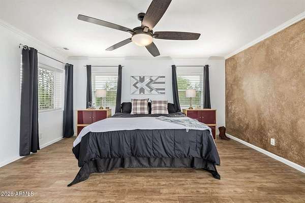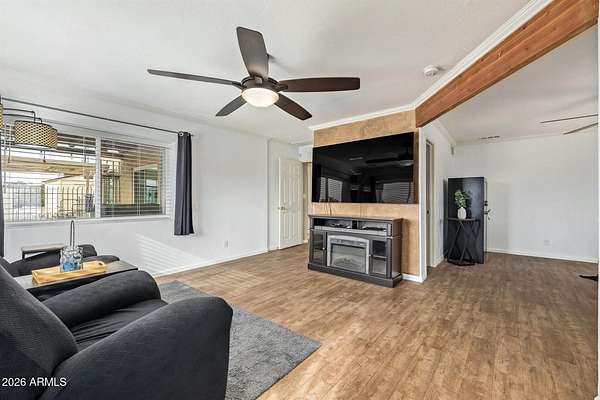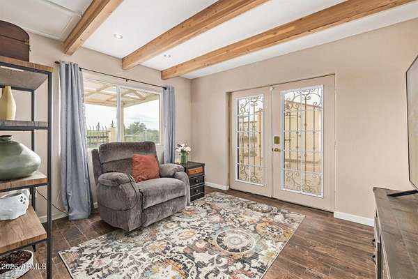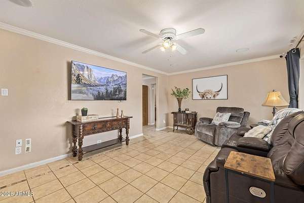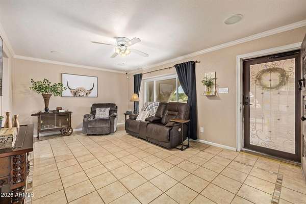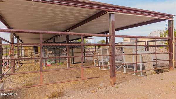 Views, horse corrals, mechanic's garage, mini-homes--this one has it all! This gem boasts SOLAR power, 4-car detached garage with loft and car lift, and an expansive paved patio with BBQ island where you can take in breathtaking mountain views and listen to the soothing fountain. Spacious kitchen offers quality cabinets, tile backsplash, SS appliances, and quartz counters. Multiple living spaces & 3 full baths make multi-gen living easy! Spacious primary retreat includes a sitting room, ensuite with tiled shower, and a walk-in closet. Flexible open den can be an office or TV room. Two mini homes add more options--outfit them for guests, tack rooms, or workshops. The multi-stall corral, hay sheds, and plenty of land makes this perfect for horse owners--there's even a bridle trail nearby! Featuring horse stable, hay shed, chicken coop, and animal pen, truly a dream setup for animal lovers. This rare find has everything you're looking for!