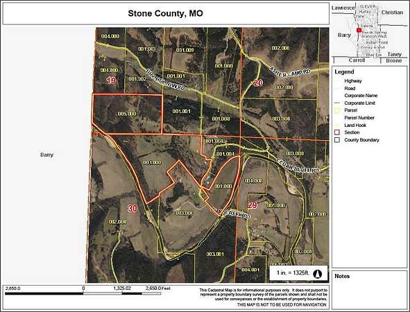 From Cape Fair take Hwy 76 West 4 miles to right on Flat Creek Road, after crossing the bridge follow to first farm house on left.