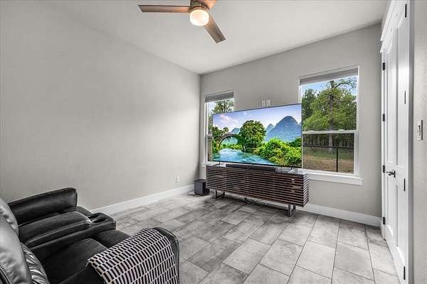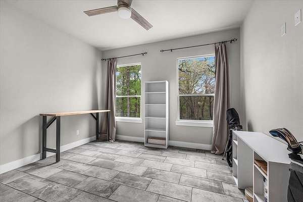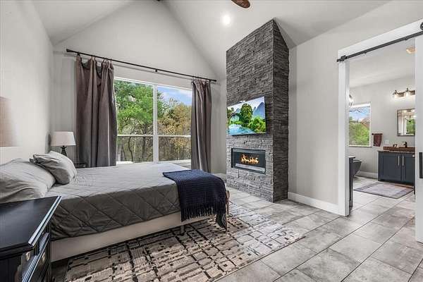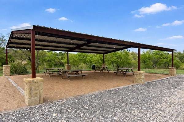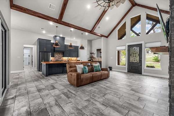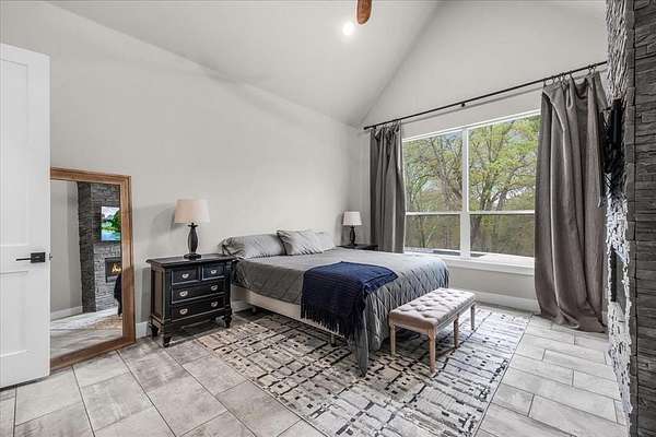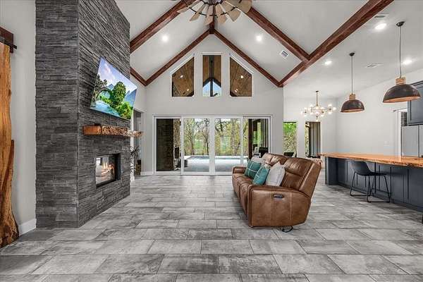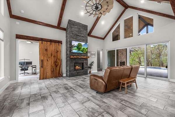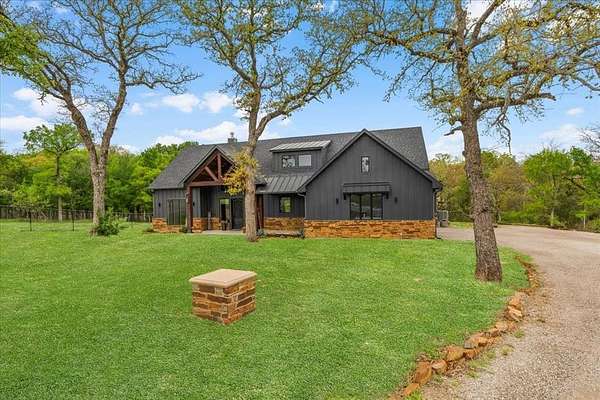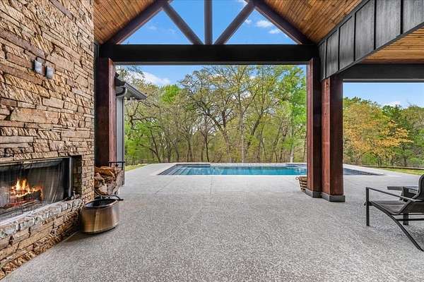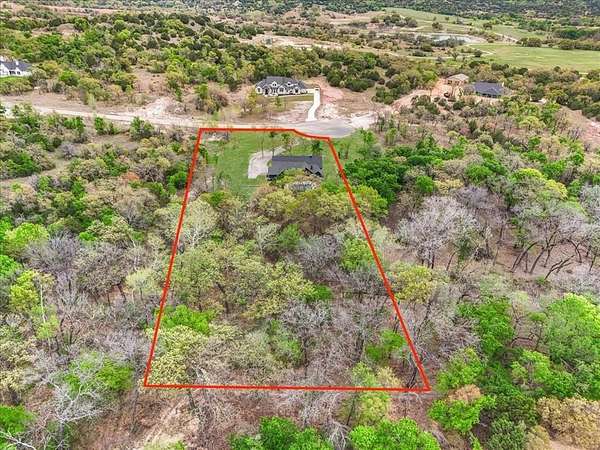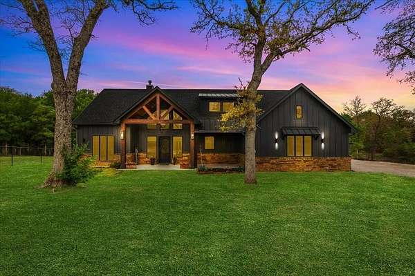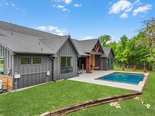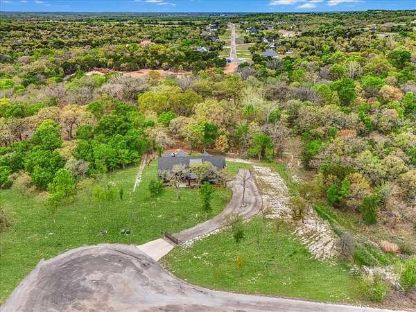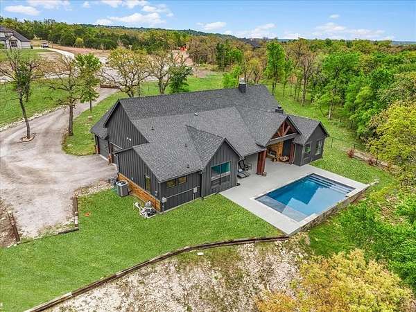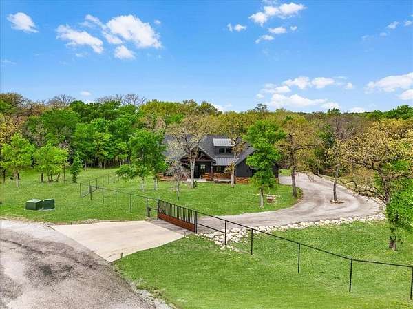 Custom home built offering 3 bedrooms plus an office that could serve as a 4th bedroom and 2 baths, with a backyard designed for both relaxation and entertaining featuring a pool with a private wooded backdrop, all viewed from expansive sliding glass doors that fully open to a large covered patio with fireplace and vaulted wood ceiling for seamless indoor-outdoor living. Situated on 3 acres in a cul-de-sac with a gated entrance, the property includes one fully fenced acre and two additional wooded acres behind the home providing exceptional privacy, a natural waterfall feature, and frequent wildlife sightings. Inside, the home showcases cathedral ceilings with exposed beams, a striking floor-to-ceiling stone fireplace accented by a custom wood mantel, a statement custom wood front door, and abundant natural light through oversized windows that frame the surrounding trees. The kitchen is anchored by a 14-foot handcrafted island with rich solid wood top, complemented by custom cabinetry, high-end finishes, and thoughtful design for both everyday living and entertaining. The primary suite offers a freestanding soaking tub, walk-in shower, dual vanities, and a spacious custom closet with built-ins, along with its own fireplace. Additional features include epoxy flooring in the garage, tankless water heater, water softener system with UV light, buried propane tank, private water well, and pre-wiring for surround sound inside and on the back patio. This smart home offers app-based control of the pool, lighting, cameras, garage door, and community gate, and is located within a gated community featuring a fishing pond and pavilion, in Brock ISD and approximately 30 miles west of Fort Worth.