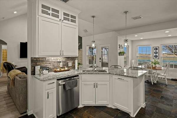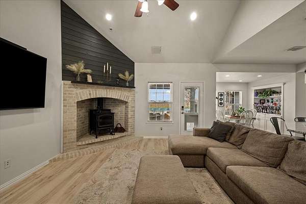 Welcome to this warm and welcoming 3-bedroom, 2-bath home in Caddo Mills, offering approximately 1,908 square feet of comfortable living space. The open-concept layout makes it easy for family and friends to gather, with a seamless flow between the kitchen, dining, and living areas. A wood-burning stove in the living room adds charm and creates a cozy spot for family nights and relaxing evenings at home. The split-bedroom design provides a private primary suite, while the secondary bedrooms are conveniently located on the opposite side of the home--perfect for kids, guests, or a home office. The layout is functional and designed with everyday family living in mind. Step outside and enjoy a backyard built for making memories. The private patio features an outdoor kitchen, built-in fire pit, and a pool--ideal for weekend cookouts, summer fun, and family gatherings. This outdoor space offers plenty of room to relax, entertain, and enjoy time together. Adding to the property is a 1,600-square-foot shop with living quarters, complete with two bay doors and a third rear door for pull-through access. This flexible space is great for hobbies, extra storage, guest accommodations, or a family workspace. With its cozy interior, thoughtful layout, and outstanding outdoor amenities, this home is a wonderful place to gather, unwind, and enjoy everyday life in a peaceful Caddo Mills setting.