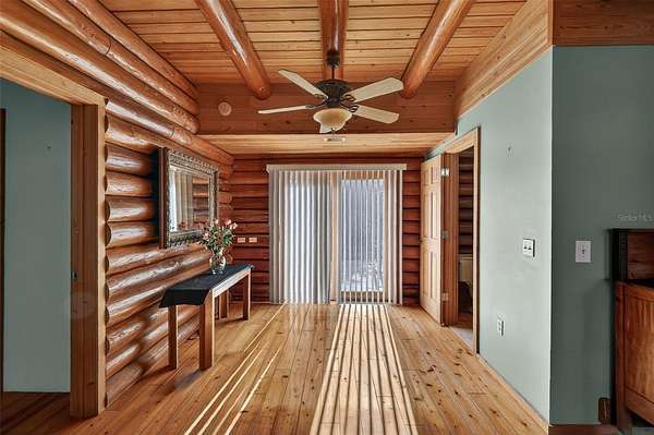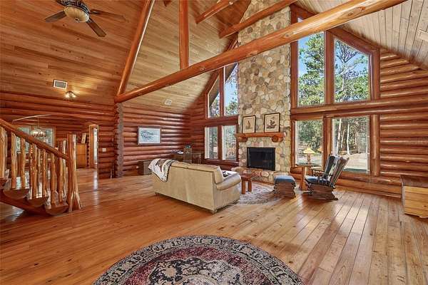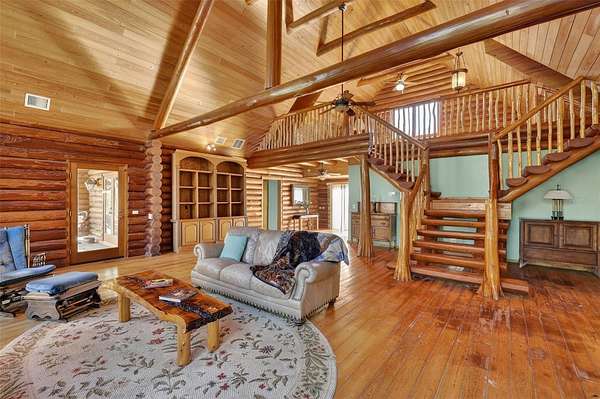 Set on almost 10 peaceful acres, this beautiful log cabin offers privacy, charm, and endless potential. Enjoy your private pond views from two front porches—perfect for relaxing and taking in the natural surroundings. Inside, soaring ceilings and a wood-burning fireplace create a warm, inviting atmosphere.