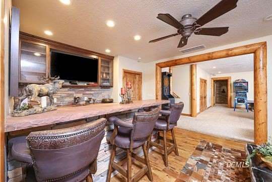 - Alarm/Security System, Carpet Flooring, Ceiling Fans, Garden Tub, Gas Fireplace, Hardwood Flooring, Home Theater Surround, Hot Tub/Spa, Smart Wiring, Stone Flooring, Theater Room, Vaulted Ceilings, Walk-In Closets, Window Coverings, Wood Fireplace