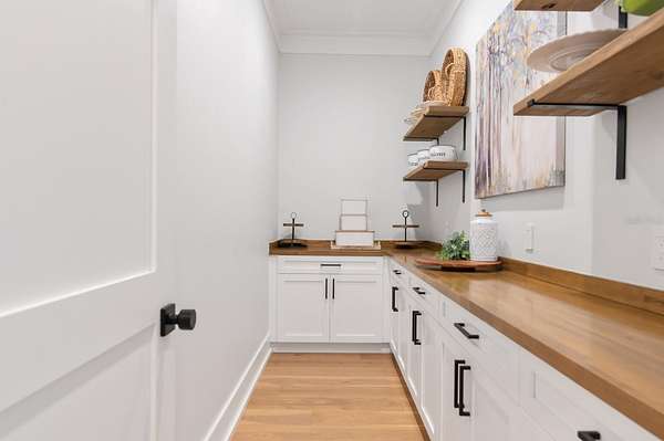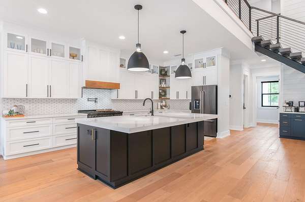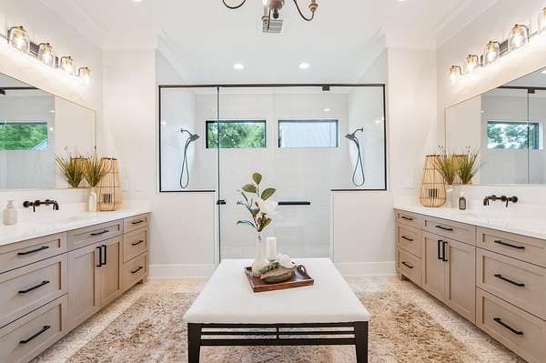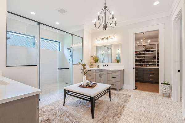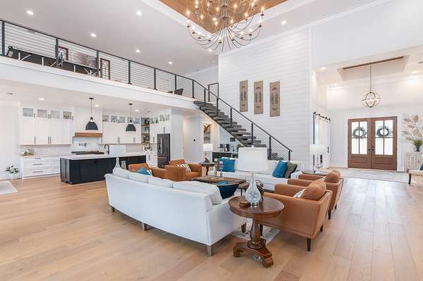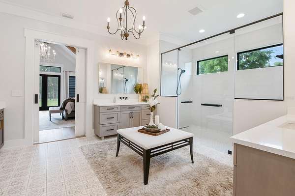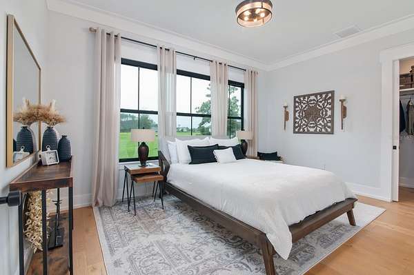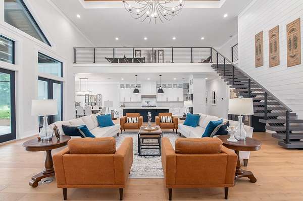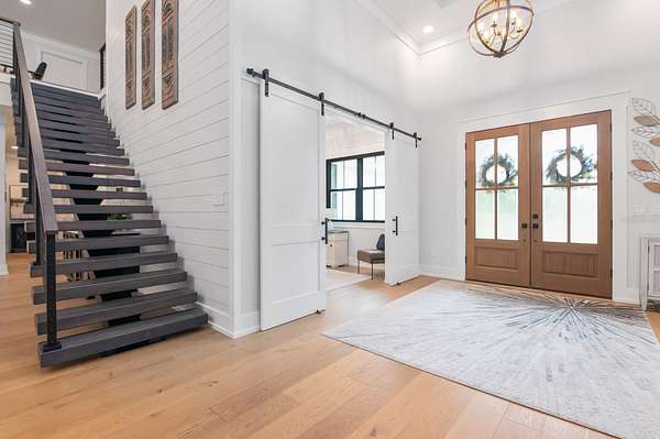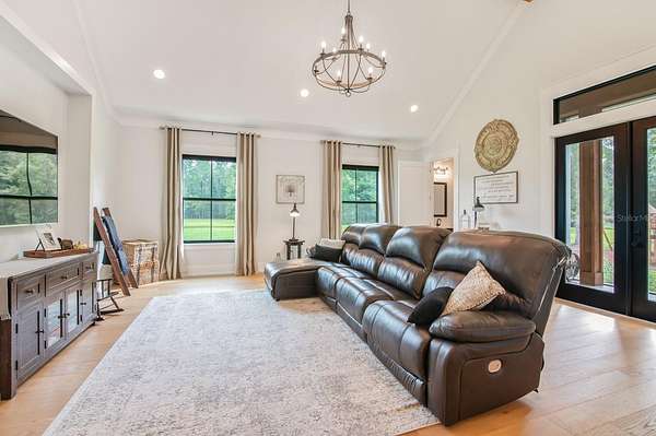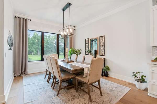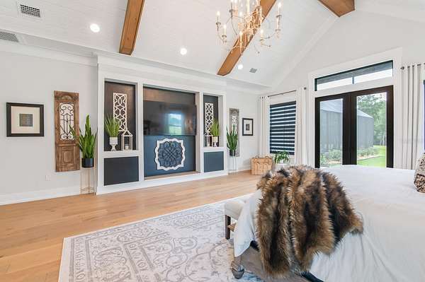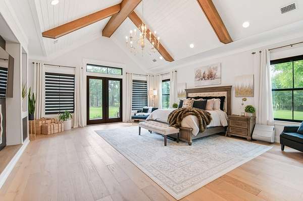 Experience refined country living in this remarkable custom-built home located within the prestigious, gated Charleston neighborhood. Set on over 6 acres, this 4-bedroom, 3.5-bath residence includes a private study, entertainment room, loft, and dedicated storage space--offering luxury and flexibility for any lifestyle. Step inside through an impressive entryway that reveals soaring 23-foot ceilings adorned with cypress tongue-and-groove accents. Rich wood floors flow throughout the home, complemented by a show-stopping staircase featuring floating solid walnut treads. The gourmet kitchen is designed for both entertaining and everyday living, featuring a large center island, high-end gas range, butler's pantry, and a coffee/wet bar for added convenience. The open-concept layout seamlessly connects to the great room, where walls of glass overlook the spectacular outdoor oasis. The primary suite is a true retreat, complete with vaulted ceilings, private glass doors leading to the pool area, and a spa-inspired en-suite bathroom. Highlights include a glass-enclosed shower, dual vanities, and a dream-worthy custom walk-in closet with built-in cabinetry and direct access to the laundry room.
