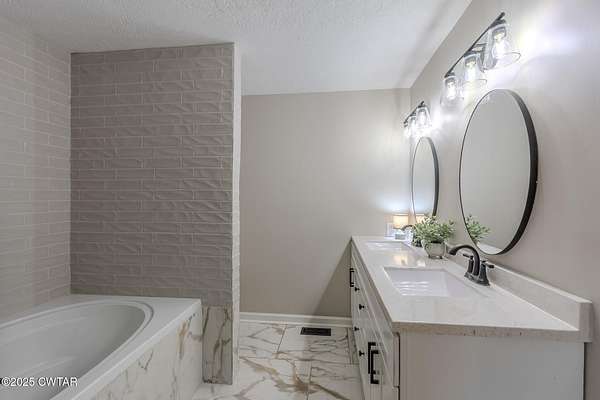 - Ceramic Tile Shower, Crown Molding, Double Vanity, Open Floorplan, Tub Shower Combo, Walk-In Closet(s)